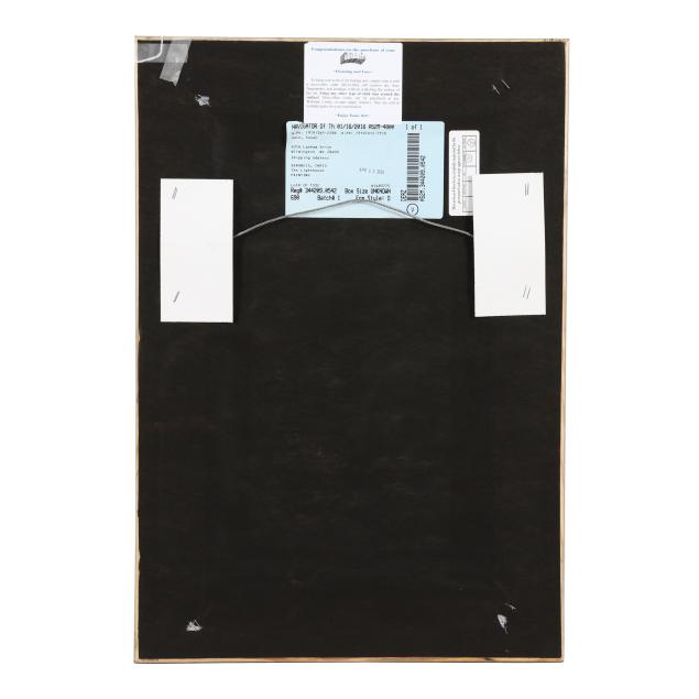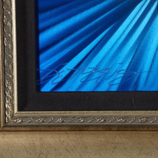 Mixed media and air-brush painting on hand ground aluminum, signed at lower right, retaining gallery label to verso and paperwork, framed.