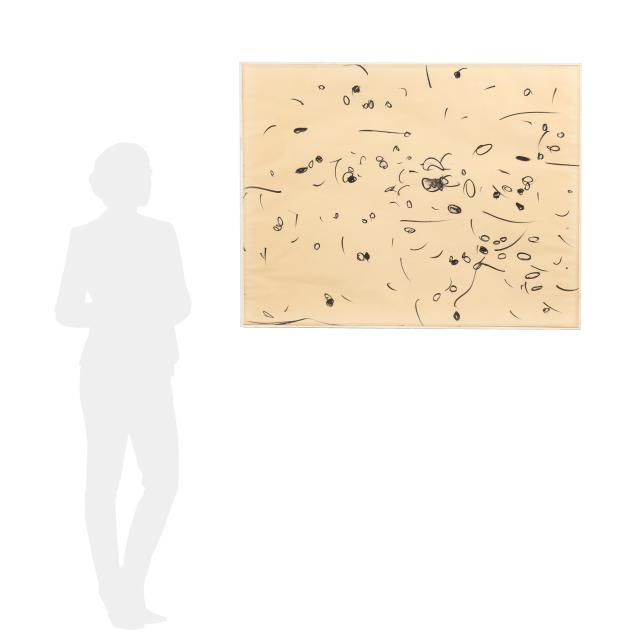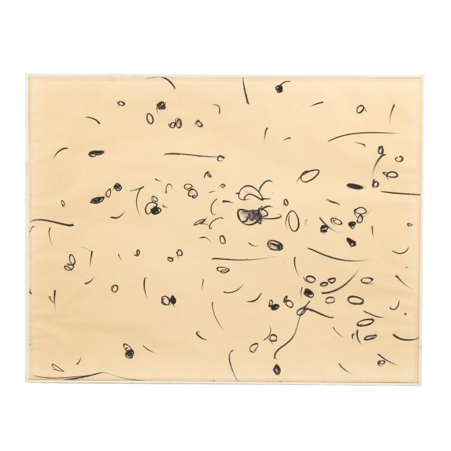 Black oil crayon on paper, not signed, framed below plexiglass.
