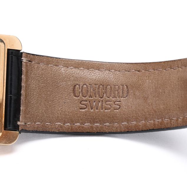 Circa 1999, quartz, Concord ETA 210.001, reference number 28209644, serial number 791369, the rectangular gold case with signed silver-tone dial, gold Roman numeral hour markers, and gold dagger hands, the signed black textured leather strap marked Louisiana / Alligator, and numbered 9240, completed with gold-tone buckle, the caseback stamped 14K and with presentation engraving.
