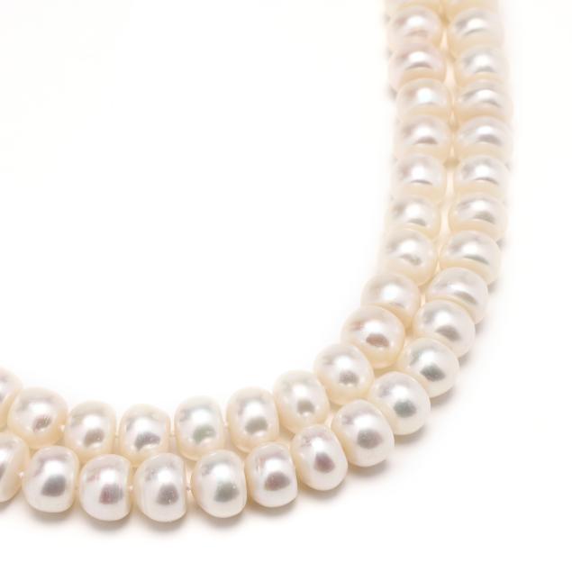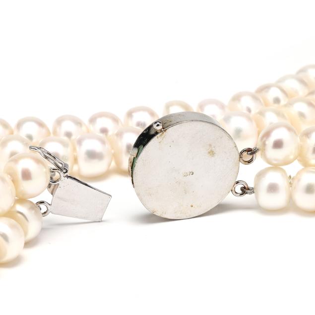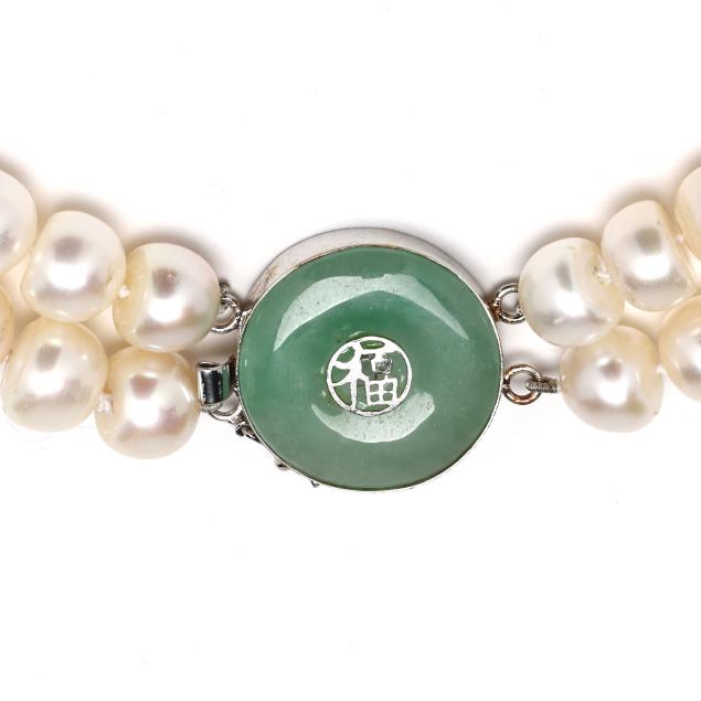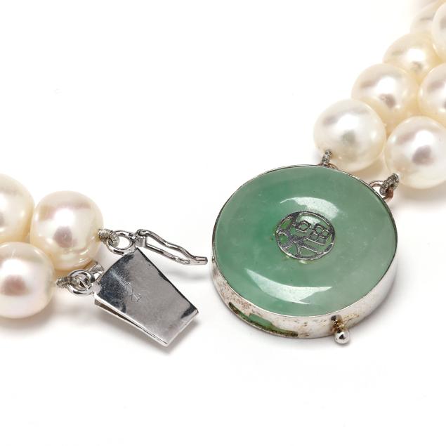 Double strand of (59) and (65) strung knotted cultured button pearls (9.0mm to 10.5mm) completed with a jadeite jade bi disc design box clasp with central auspicious symbol, with figure eight safety, clasp stamped S925.