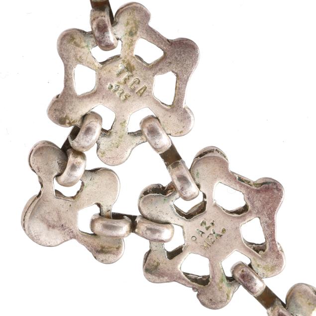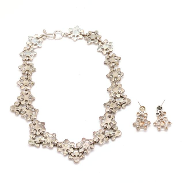 The necklace designed in a repeating hexagonal motif, the five center motifs with drops, completed with a hook and eye clasp, stamped Teca / 925 and Paz. / Mex. (1 1/8 x 16 in.); the earrings en suite with hexagonal drops and a ball and triangle surmount, completed with posts (1.25 in.).