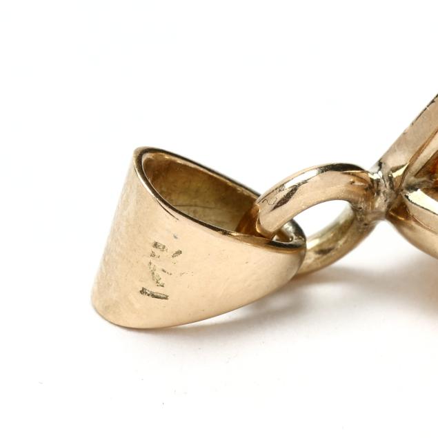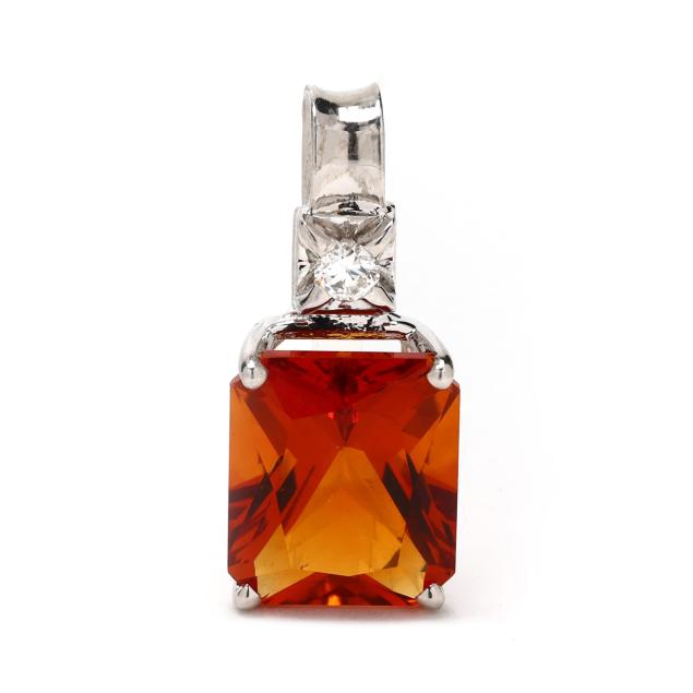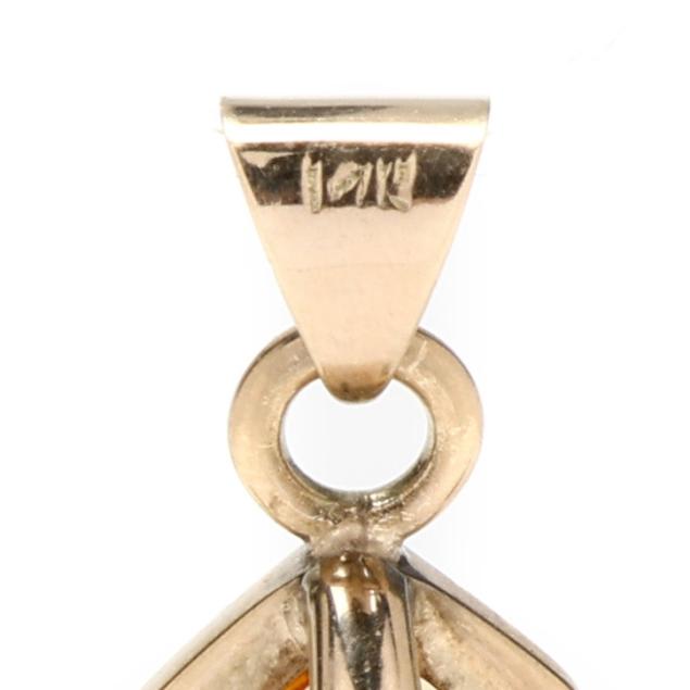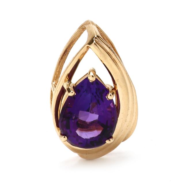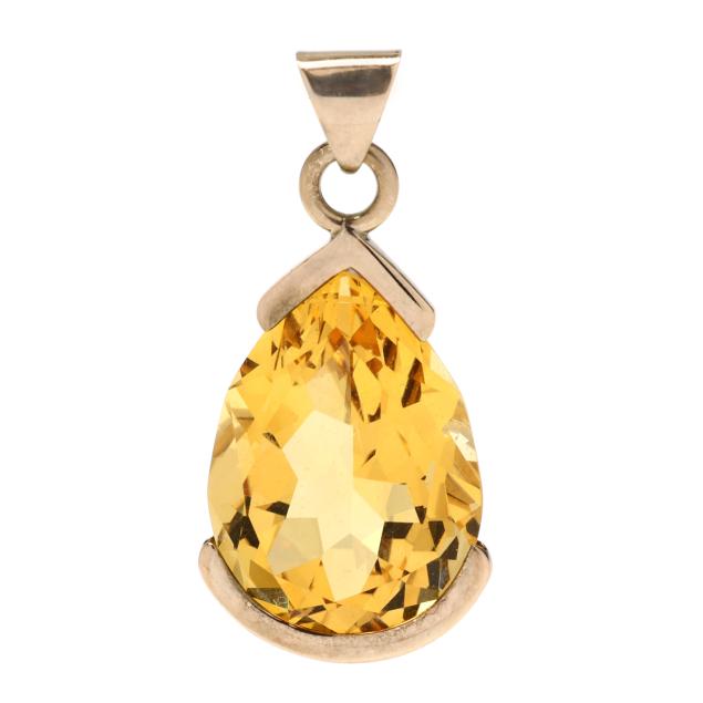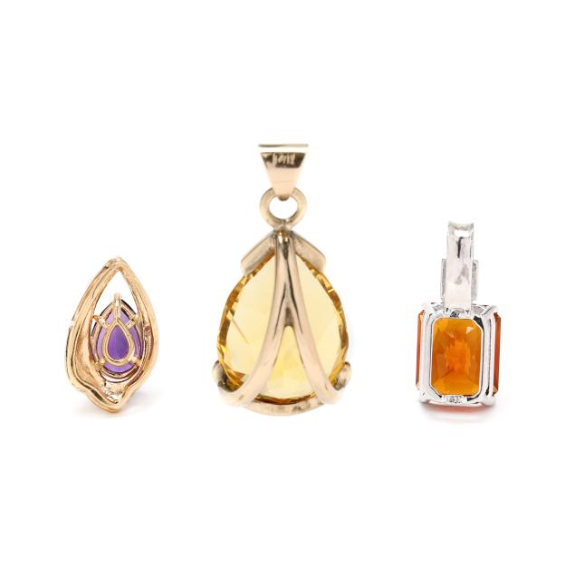 To include: a gold pear shape slide pendant with a prong set pear cut amethyst (11.0 x 7.9 x 5.75mm) weighing approximately 2.60 carats, testing 14KT (13/16 in.); a gold pear shape pendant set with a pear cut citrine (23.1 x 17.0 x 11.2) weighing approximately 23.15 carats, completed with a bail stamped 14K, pendant testing 14KT (1.5 in.); and a white gold rectangular pendant set with a rectangular cut citrine (13.0 x 11.0 x 7.9mm) weighing approximately 16.00 carats, completed with a bail set with a full cut round diamond (3.1mm), pendant stamped 14K, bail testing 18KT (1 in.).