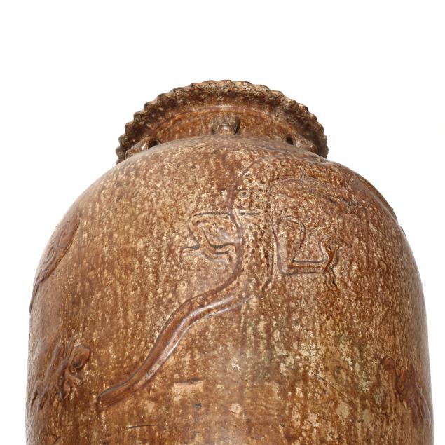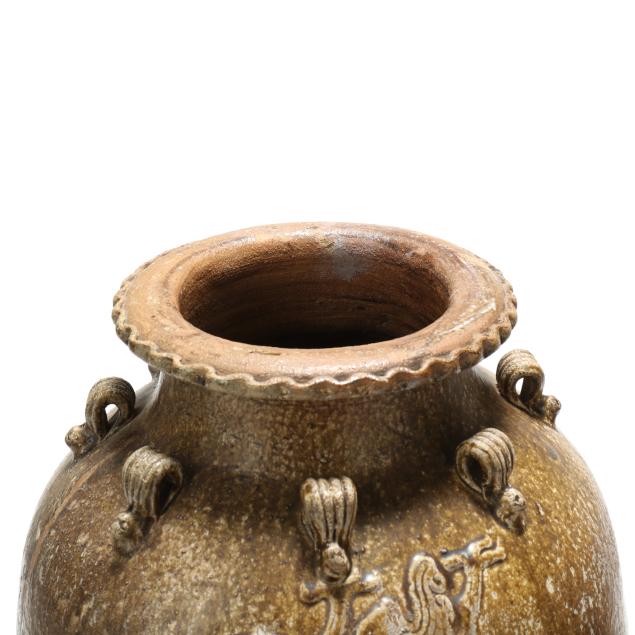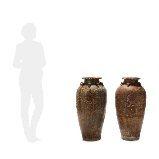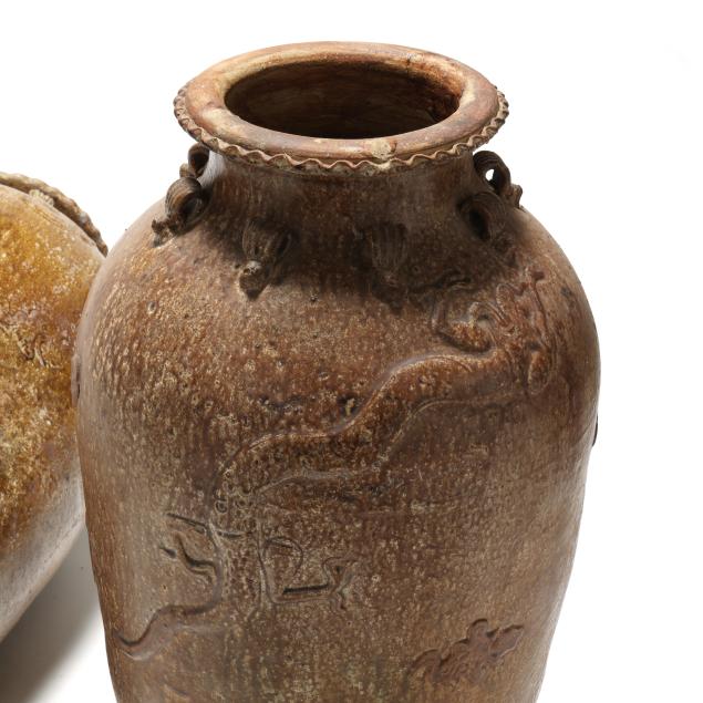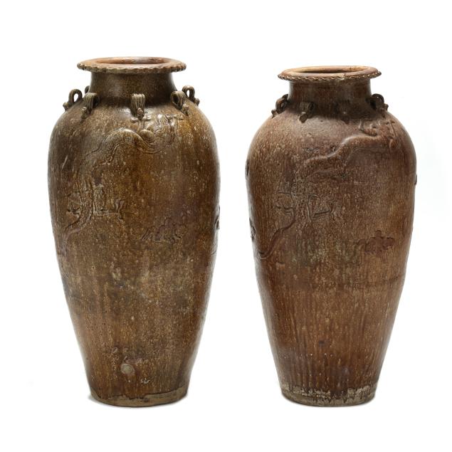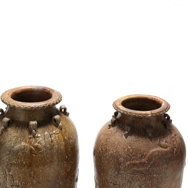 Early 20th century, two large floor jars with tan brown glaze, with multiple strap lug handles to around the rim of each, pie crust edge rim, molded dragons to the body of each, unglazed to the underside.