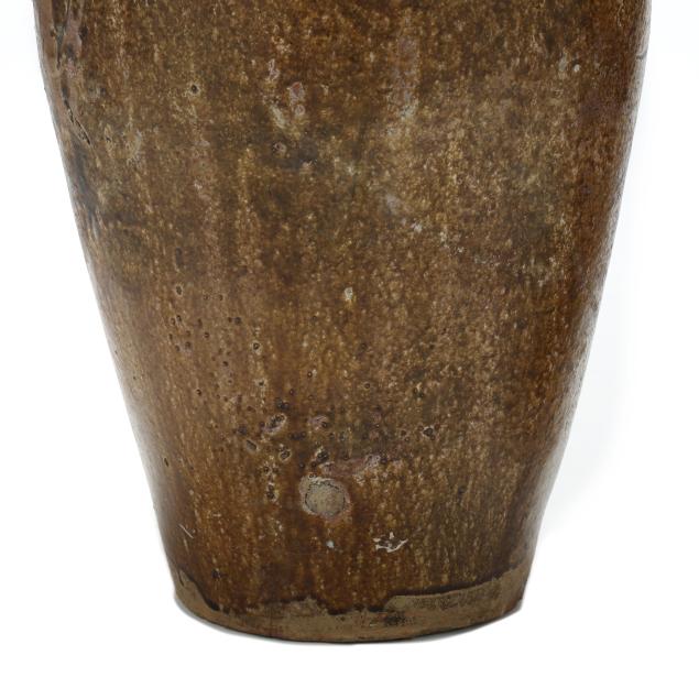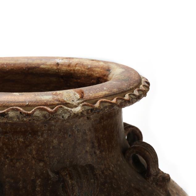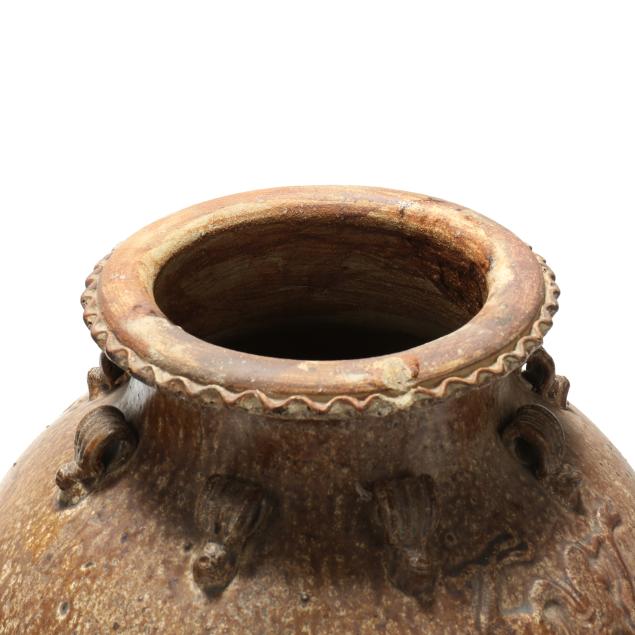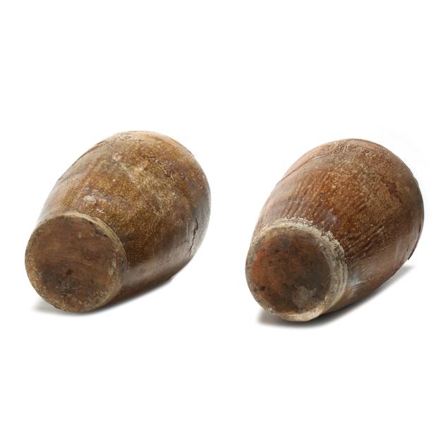 From the Estate of the late Susan C. Frankenberg, Hillsborough, North Carolina Glaze and firing anomalies as made; the taller with crack and repair with staple to base; the shorter with chip to rim, hole to body, chip to one decorative bas relief element on body.
