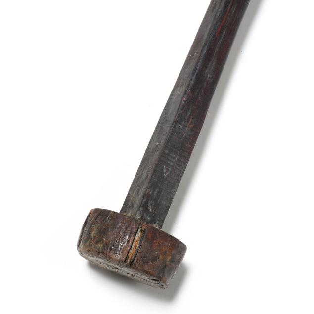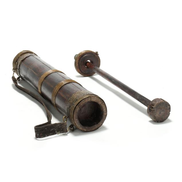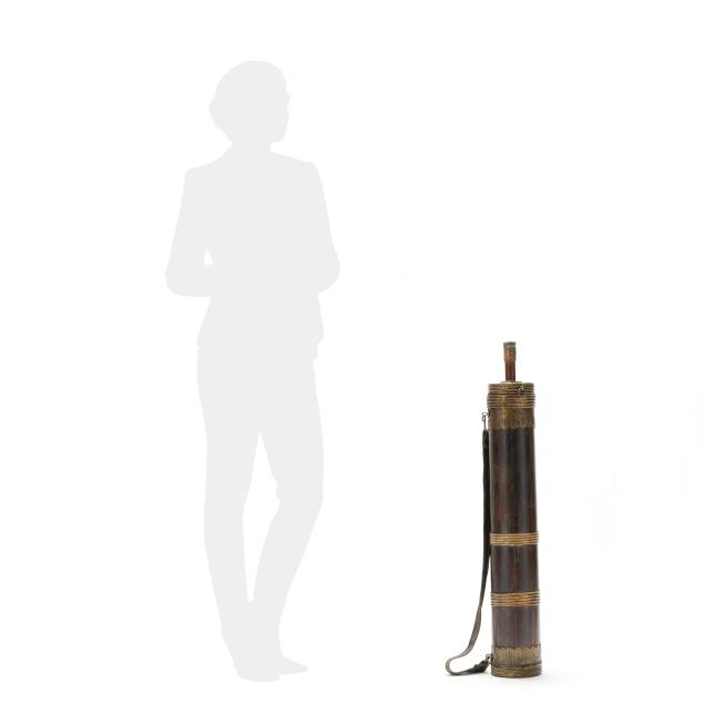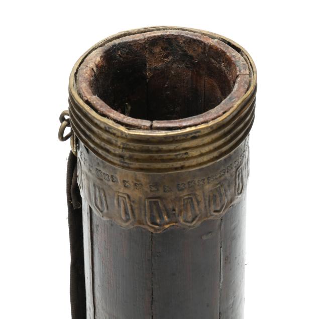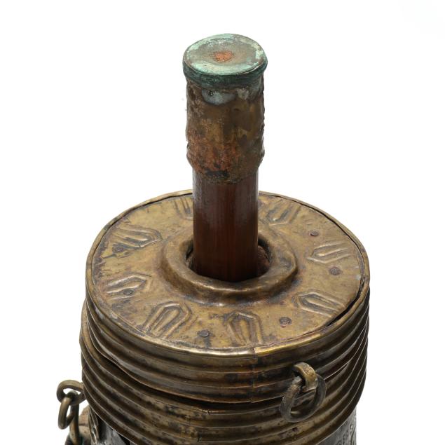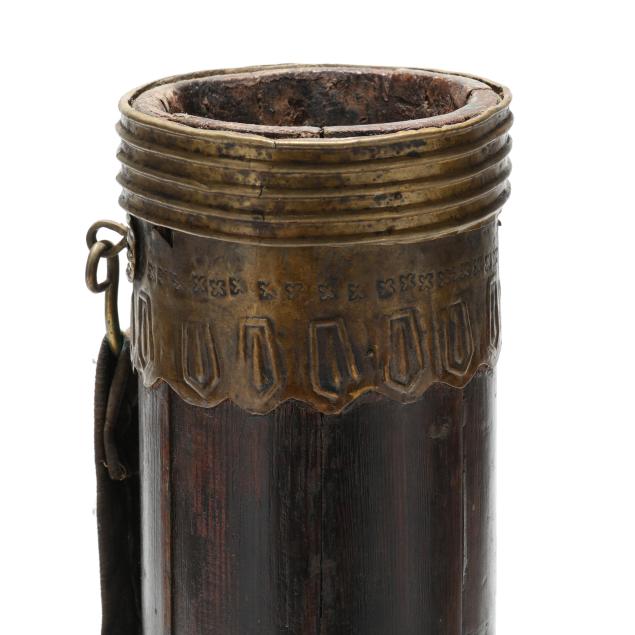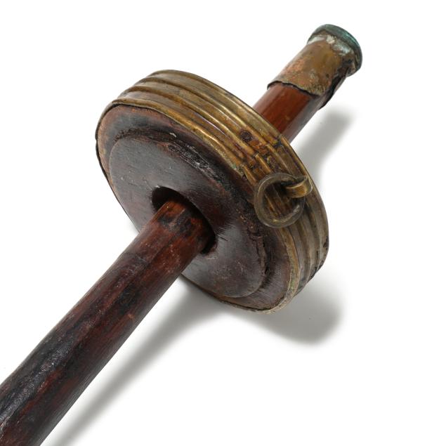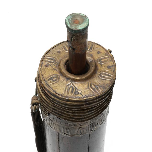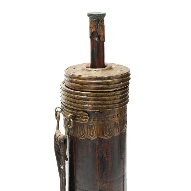 From the Estate of the late Susan C. Frankenberg, Hillsborough, North Carolina Overall wear and aging to brass mounts and wood; churning stick with some loss to brass handle; areas of cracking to wood; wear to strap; small areas of verdigris to brass mounts.