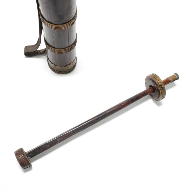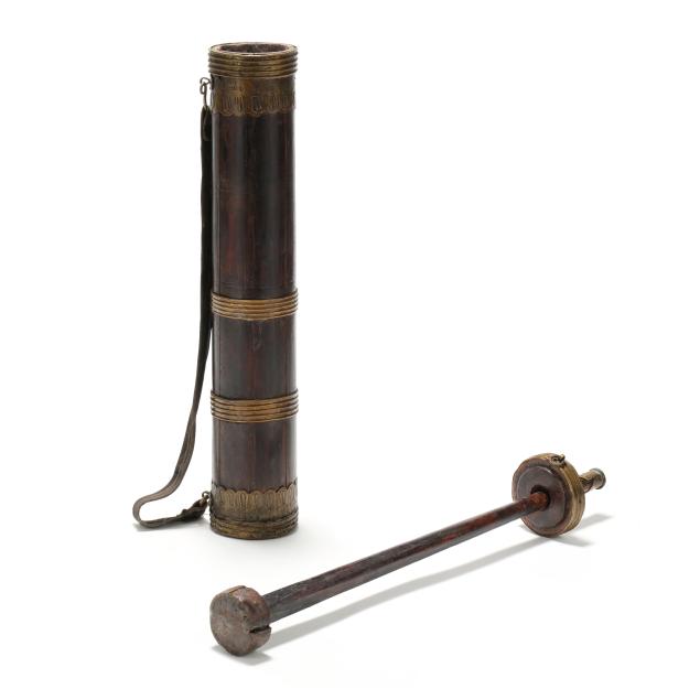 19th century, carved wood with incised metal mounts, the cylindrical vessel with plunger that separates, attached strap to body for carrying.