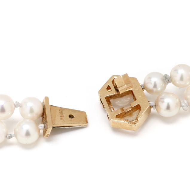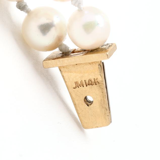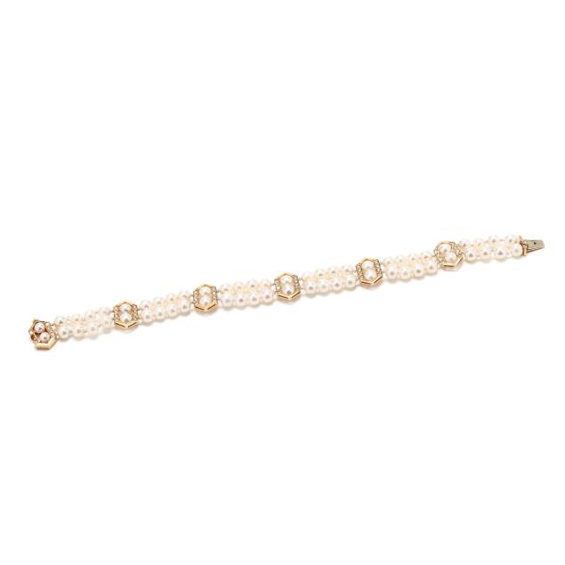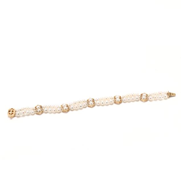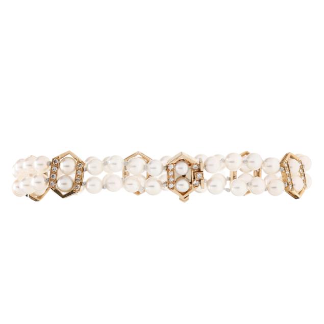 A double strand bracelet, each strung with (29) round cultured pearls (5.0-5.5mm), with five gold stations set with full cut round diamonds, completed with a matching gold locking clasp set with full cut round diamonds and two half round pearls (4.25mm), stamped JM 14K. The total diamond weight is approximately .94 carat (H-I color, I1 clarity).