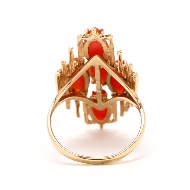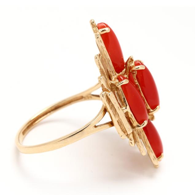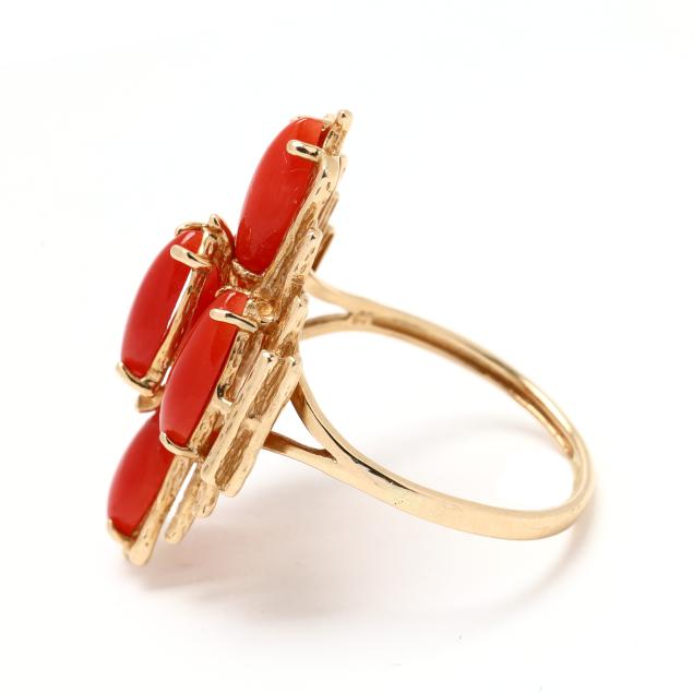 Set with (5) marquise cabochon cut coral (10 x 5mm) within a textured gold surround, completed with a split shank, stamped 14K and with a partial maker's mark.