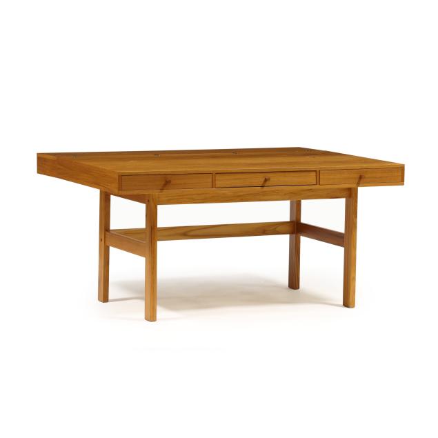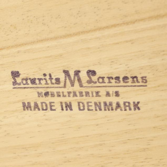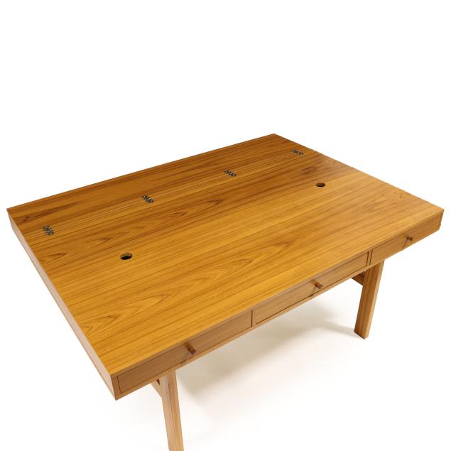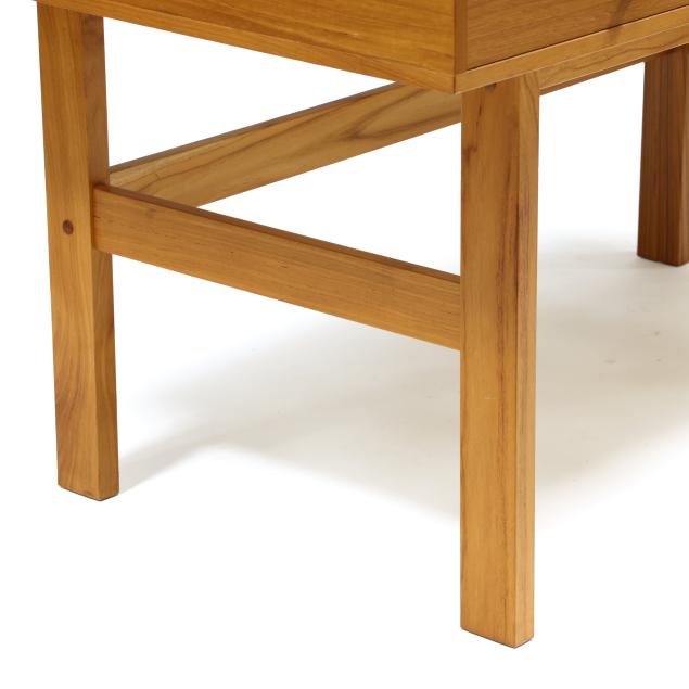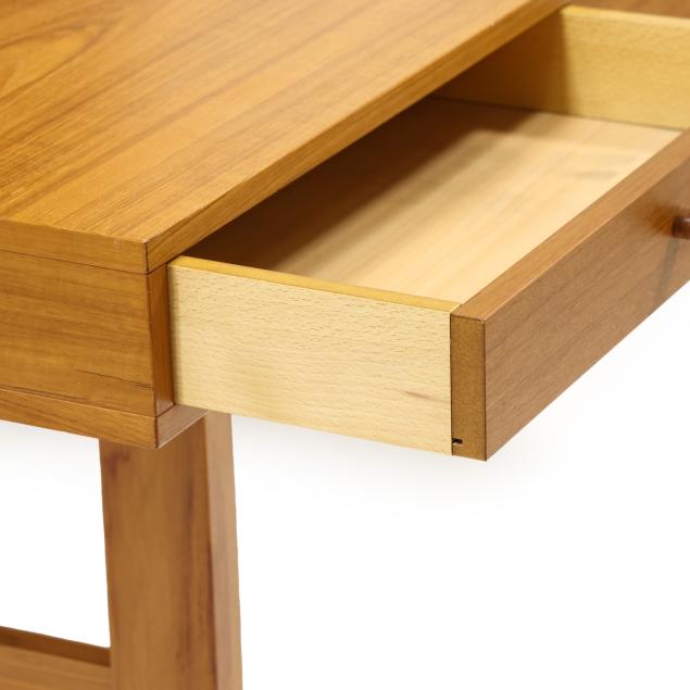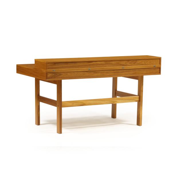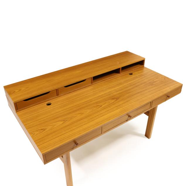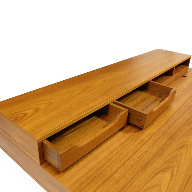 Circa 1970, two part form, teak veneer, upper writing surface with rear hinged compartment with two divided compartments and two document drawers, the writing case with three flush drawers and rear wire receptacles, set on a straight leg stand with stretcher supports, stamped "Laurite? M. Larsens"