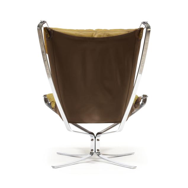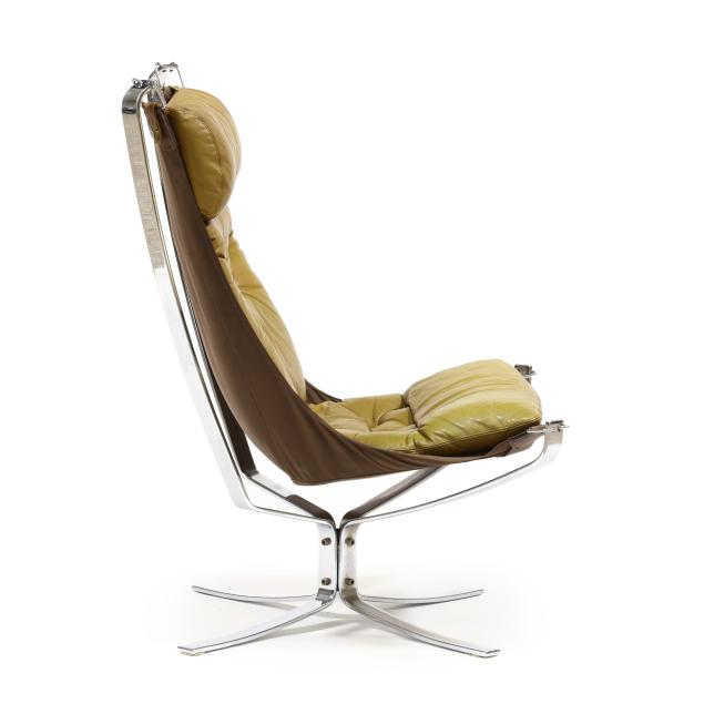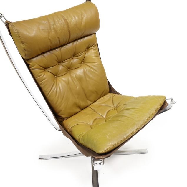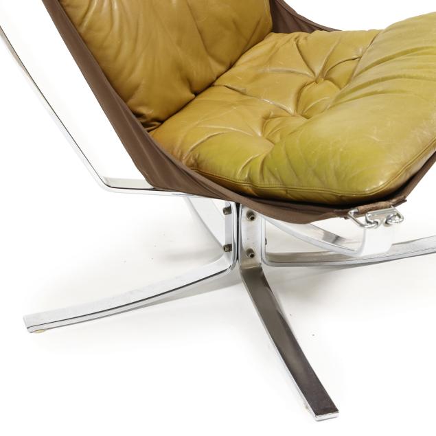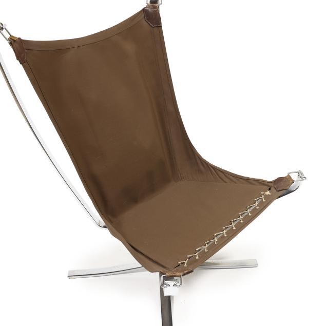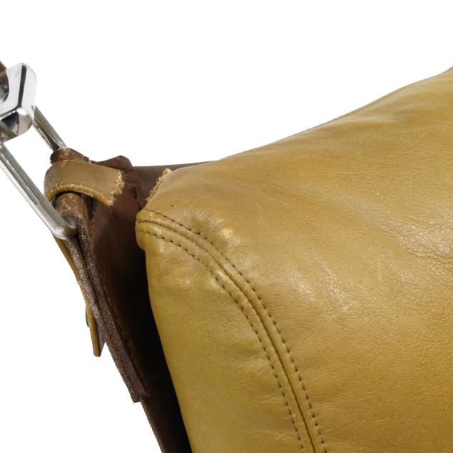 Circa 1970, olive-brown leather with canvas sling, chromed steel and buckle supports, unmarked.