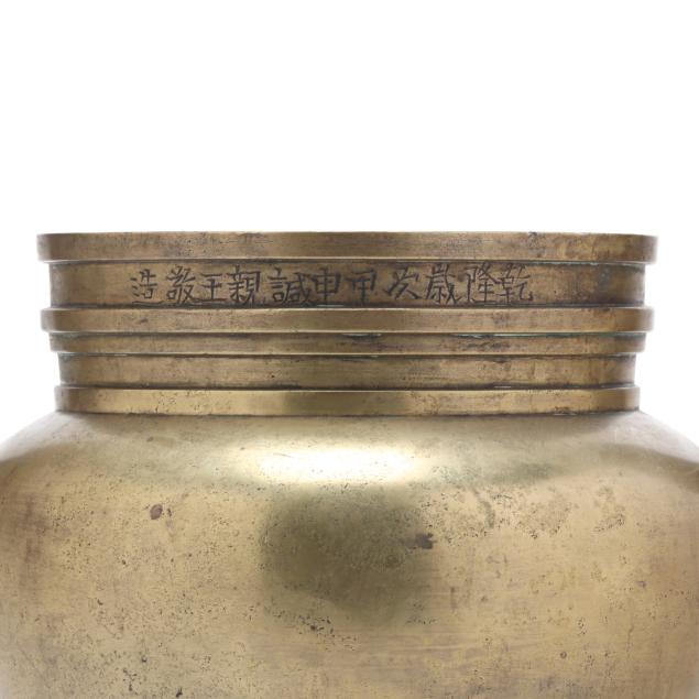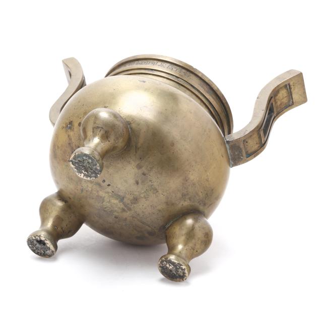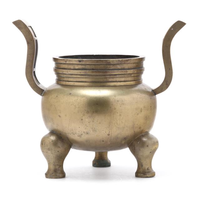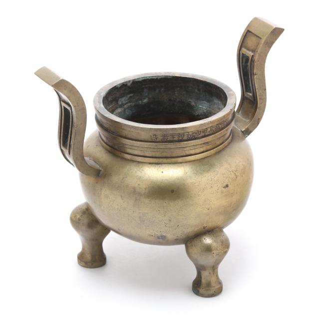Cast in an archaic shape with long handles to the sides the curl upwards, the bulbous body is raised on three stout feet, inscribed in Chinese on the neck.