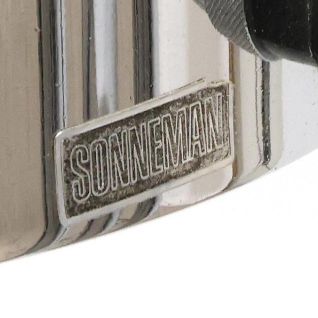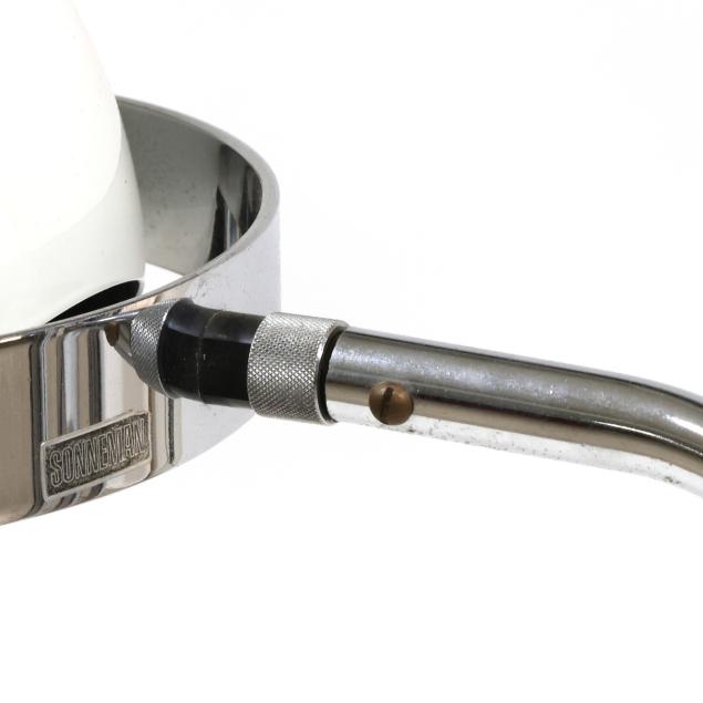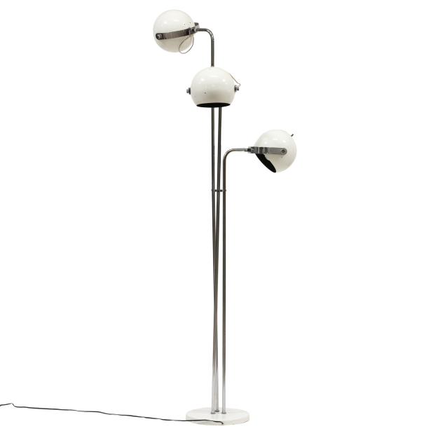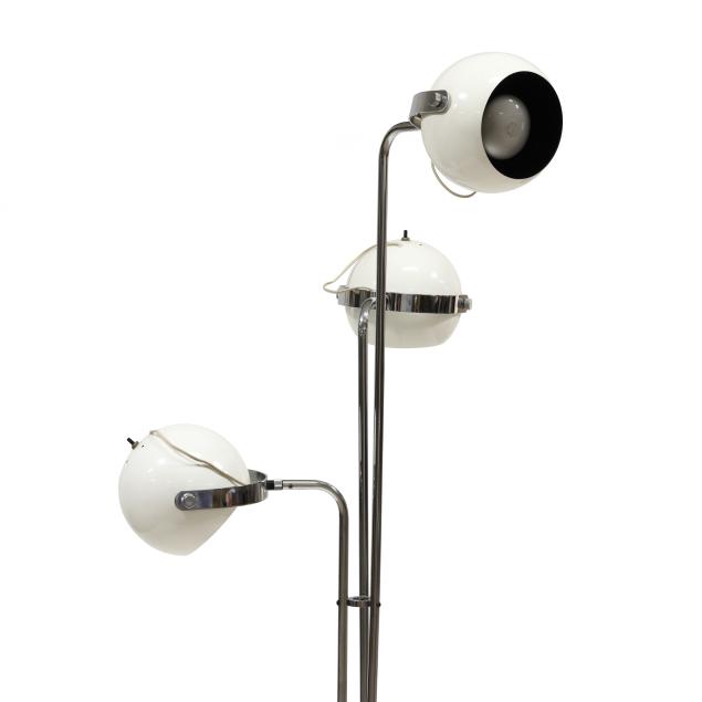 Circa 1970, white enameled metal "eyeball" adjustable shades, polished steel armatures, white enameled metal base, labeled.