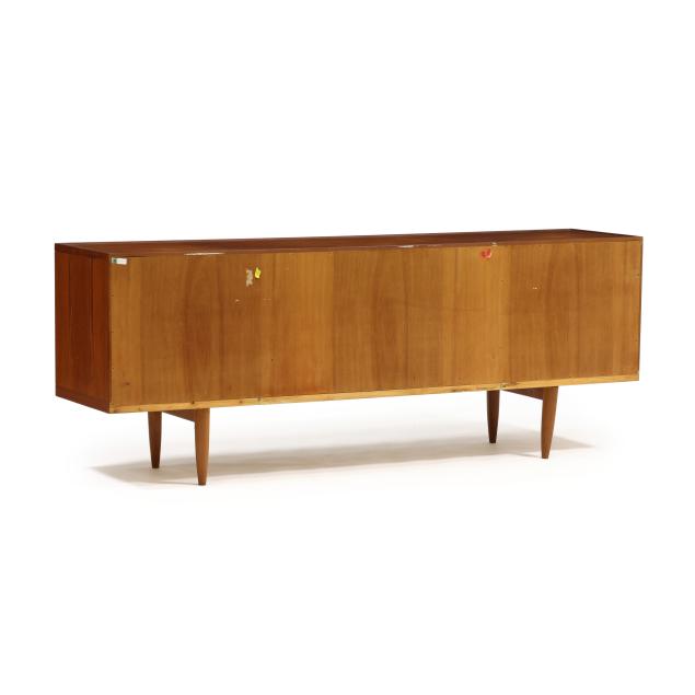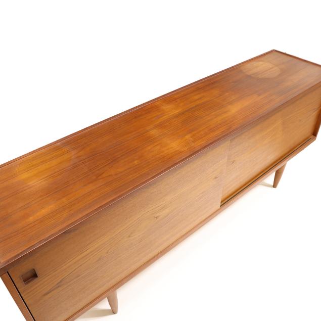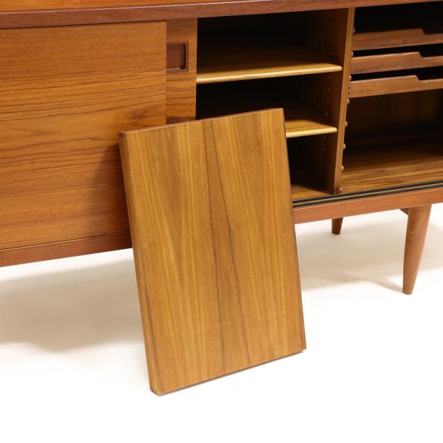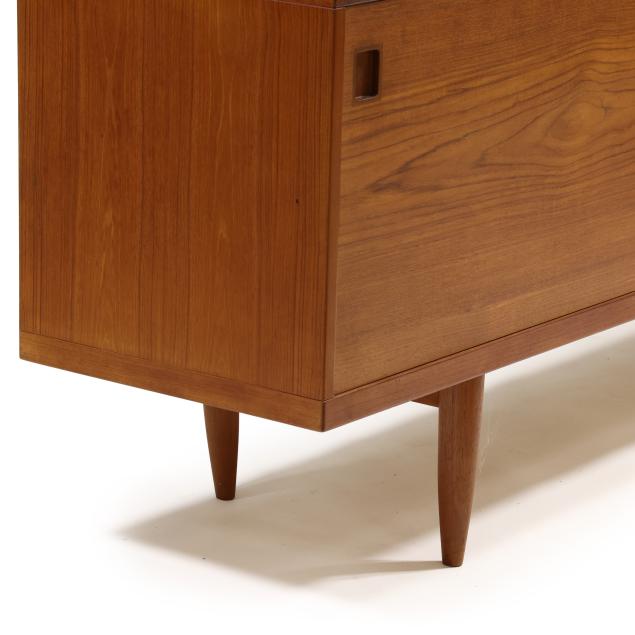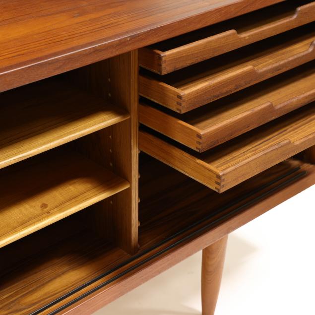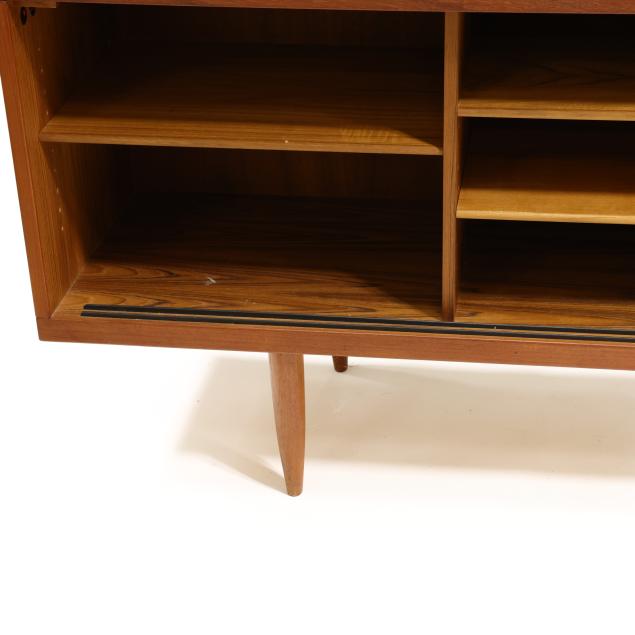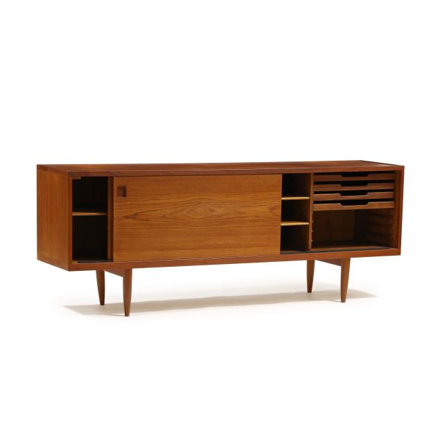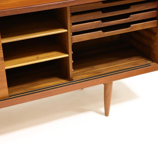 Circa 1960, teak, teak veneer, recessed panel top, two large sliding doors, divided and shelved interior with four fitted drawers, tapered legs, unmarked.