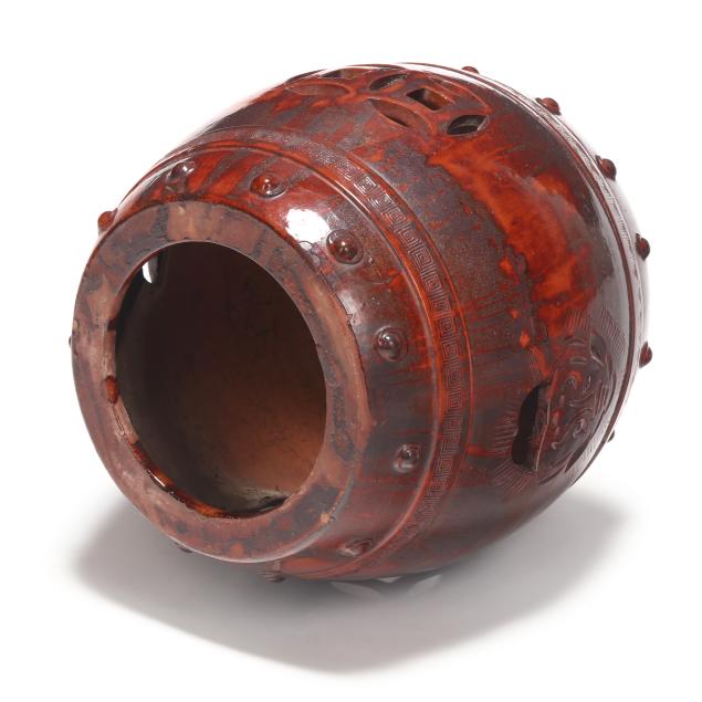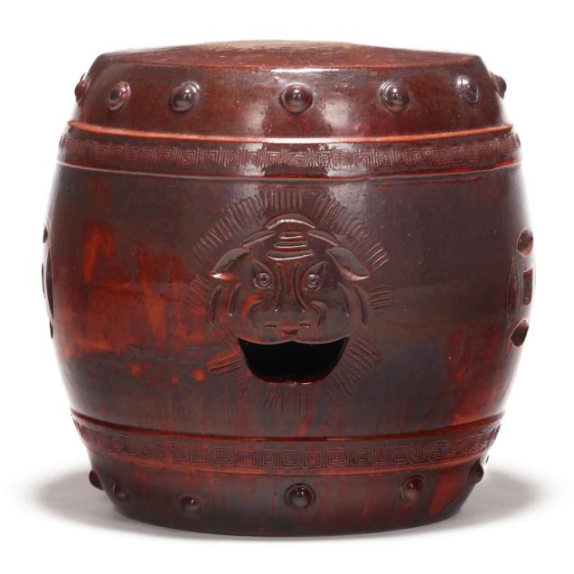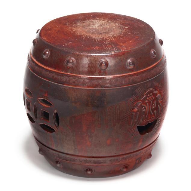 20th century, metallic red/brown glazed short garden stool with incised lion decoration and reticulated geometric patterning, unmarked.