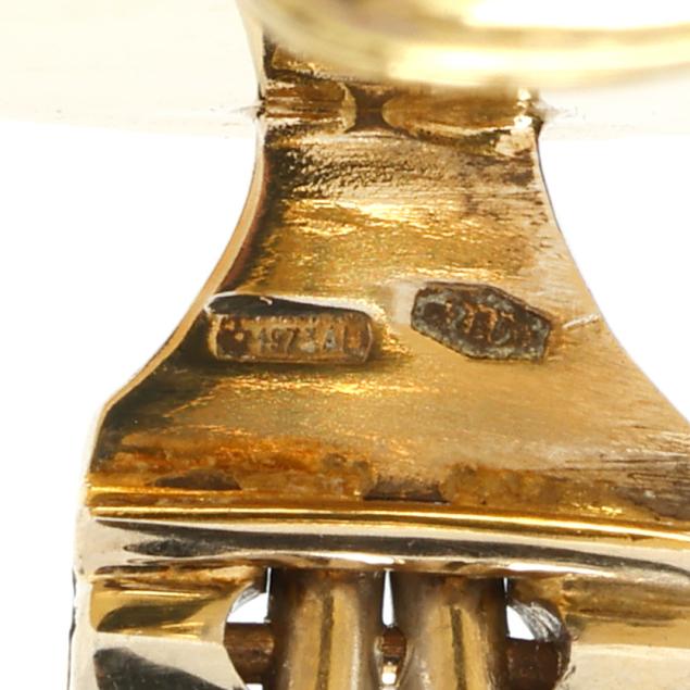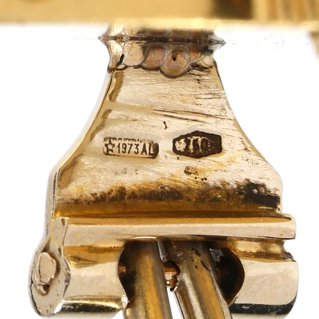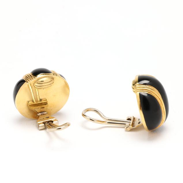 Button design earrings with fluted gold bands alternating with convex black enamel sections, completed with omega clip backs, stamped 750 and with Italian registry mark 1973 AL.