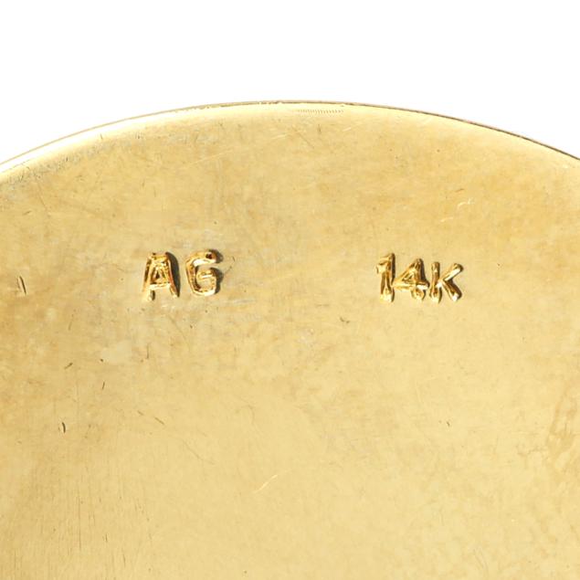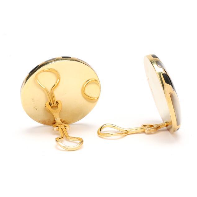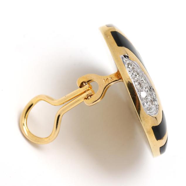 Of circular form and inlaid with curved design onyx plaques and mother-of-pearl and with gold line inlay accents, with full cut round diamonds weighing approximately .32 total carat (H-I color, SI1-SI2 clarity), with gold support, completed with omega clip backs, signed AG and stamped 14K.