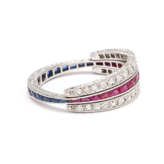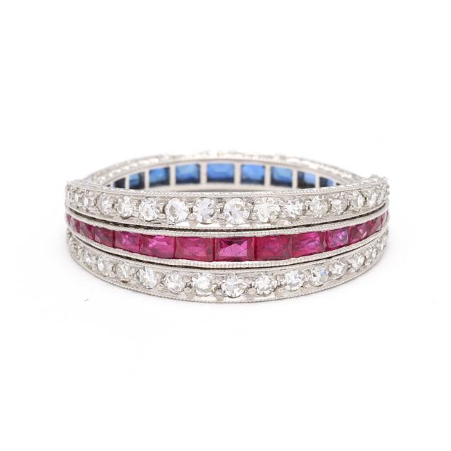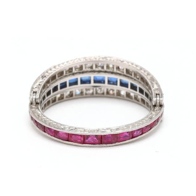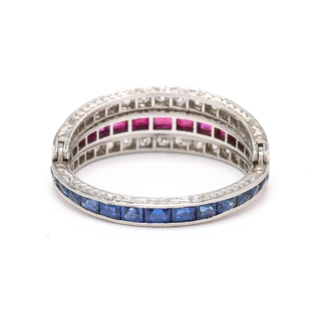 The center band set with graduated French cut rubies (1.75 x 1mm to 2.5 x 2mm) to one side, and graduated French cut sapphires (2 x 1mm to 2.5 x 2mm) to the opposite side, with two hinged bands set with single cut diamonds weighing approximately .44 total carat (G-H color, VS2-SI1 clarity), the edges of each band with floral and foliate engraving, testing platinum.