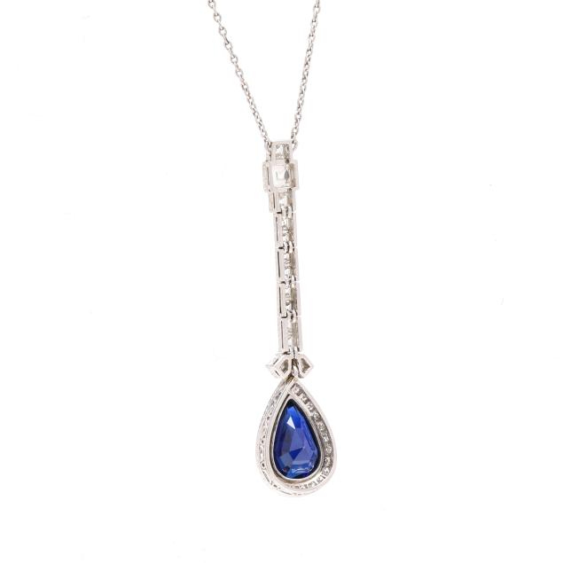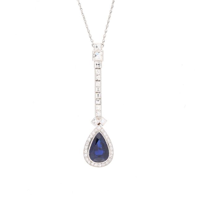 The drop pendant with a pear cut sapphire (11.3 x 7.5 x 5.32mm) weighing approximately 3.34 carats, the conforming surround set with single cut diamonds suspended from an articulated bar set with square cut diamonds, and joined to an oval link chain completed with a spring ring clasp, chain and pendant testing platinum. Total diamond weight is approximately 1.25 carats (H-I color, VS2-SI2 clarity).