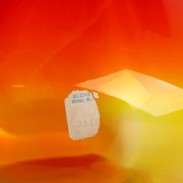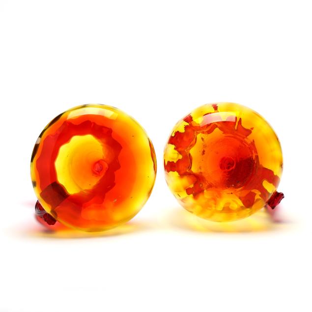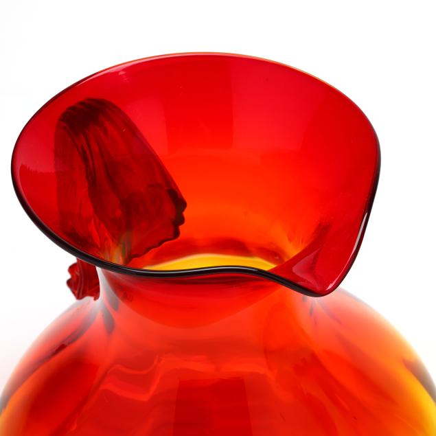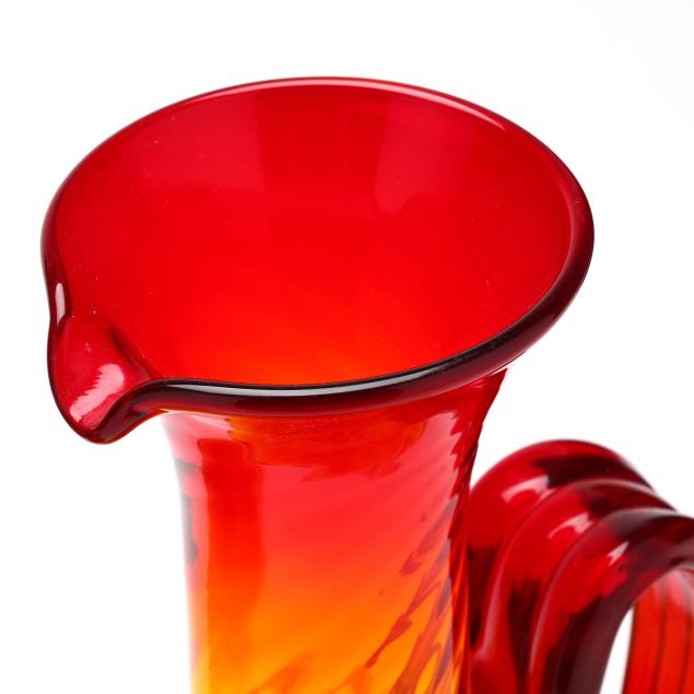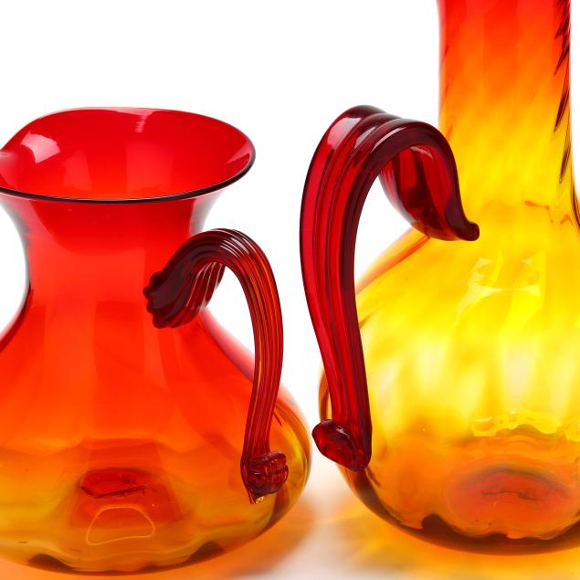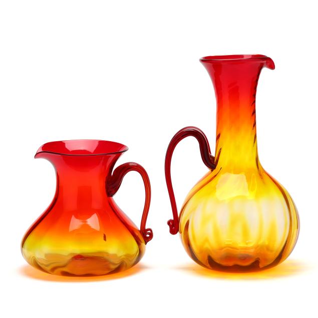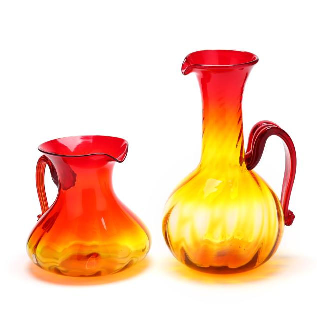 West Virginia, mid-20th century, each with applied ribbed handle, the first, a bulbous squat pitcher, with partial label to base (9 1/4 in.); the second, a tall ewer, unmarked (15 1/2 in.).