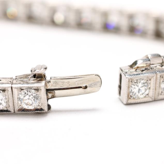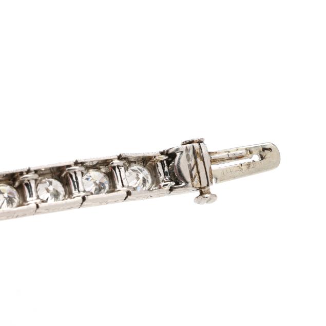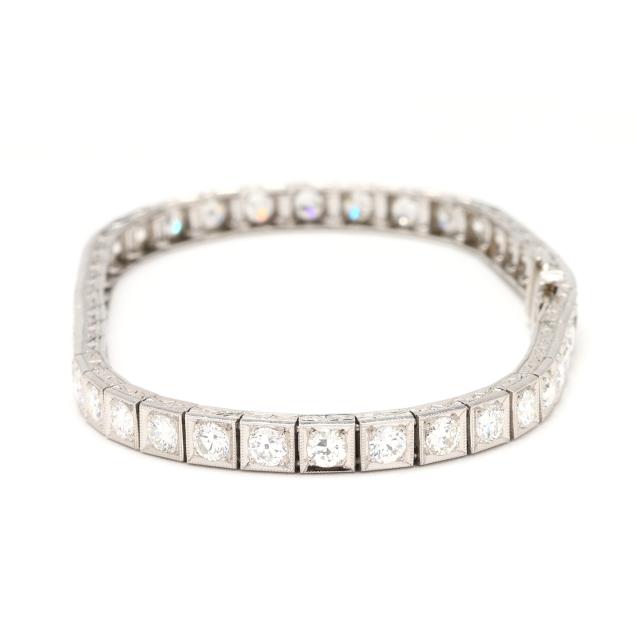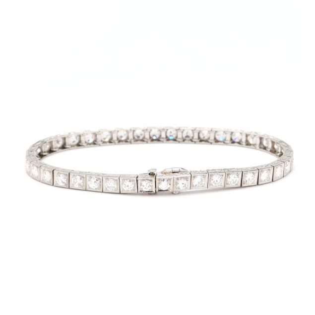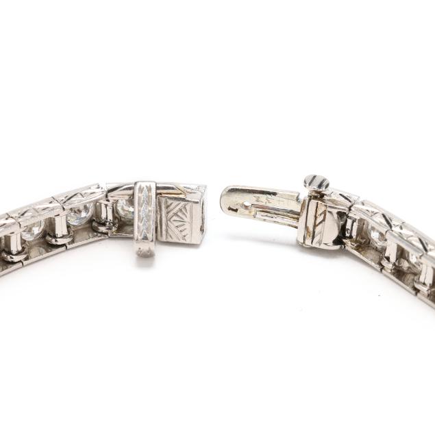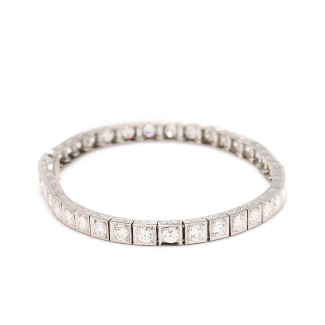 Set with (40) individual milgrain detailed links, bead set with transitional cut diamonds weighing approximately 5.25 total carats (G-H color, VS1-VS2 clarity), the edges of the bracelet with engraved geometric motifs, completed with an integrated clasp with fold under safety, testing platinum, tongue numbered 1433.