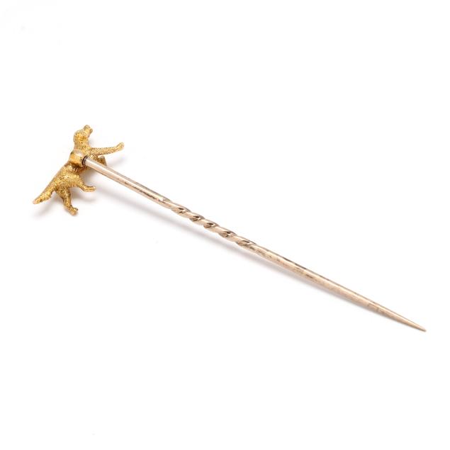 The surmount in the form of a dog on point, atop a gold pin stem, dog and pin stem testing 14KT.