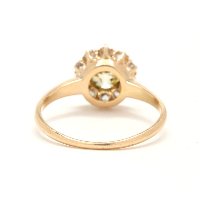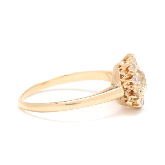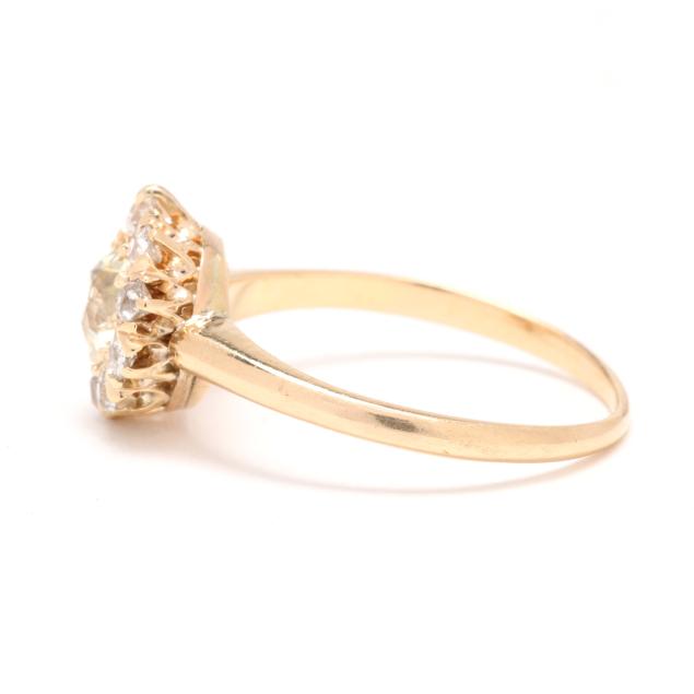 Centered on an old European cut diamond (5.3 - 5.4 x 3.55mm) weighing approximately .66 carat (Fancy Yellow color, VS1 clarity), within a round cut diamond surround weighing approximately .27 total carat (J-K color, SI2-I1 clarity), completed with a shank, testing 14KT.