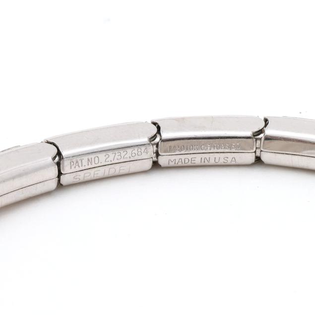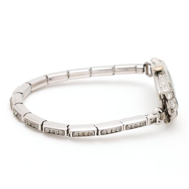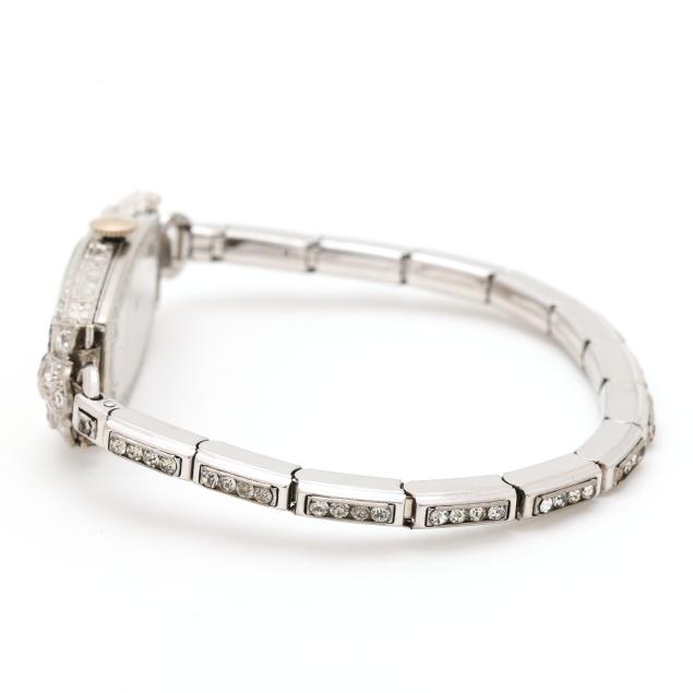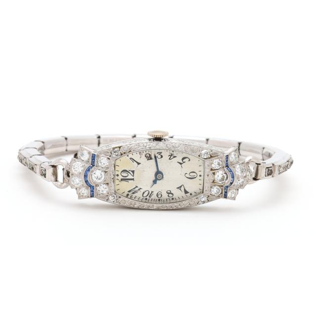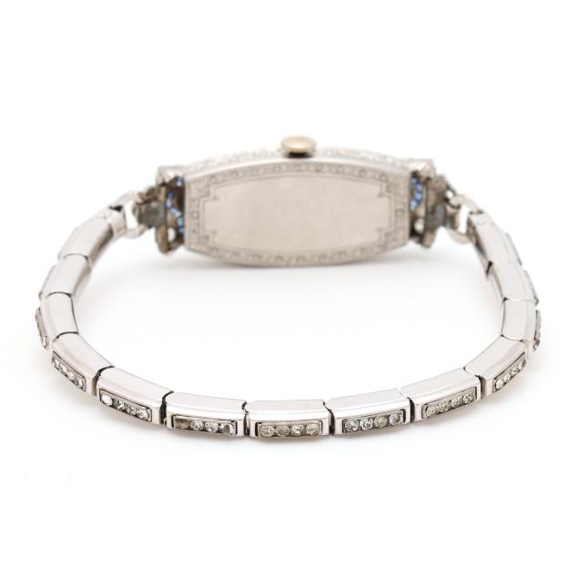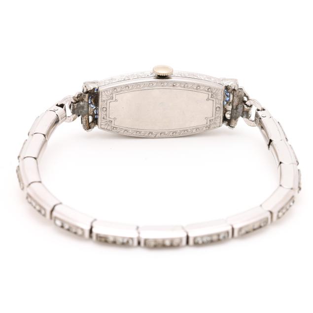 Manual wind, caseback number 7546, the tonneau platinum case finely engraved with scrolled, floral, and foliate motifs, set to the top and bottom with full cut round and single cut diamonds weighing approximately .85 total carat (G-H color, SI1-SI2 clarity), and with French cut sapphires, the silver-tone dial with black Arabic numeral hour markers, and blued steel modern hands, and the gold plated expansion bracelet set with round cut diamond simulants, the interior case back numbered 7546 and stamped Platinum.
