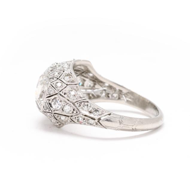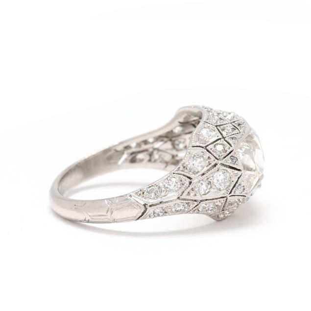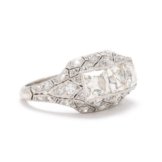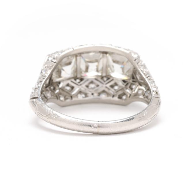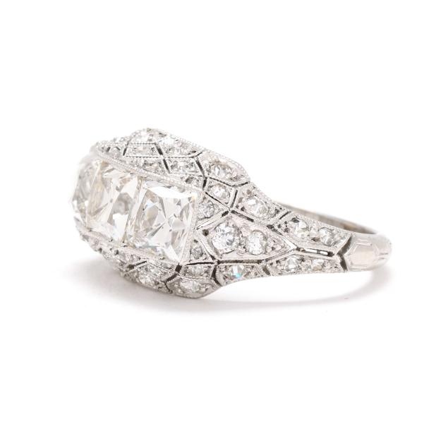 The ring centered on a convex bezel setting with three square cut diamonds (5mm) weighing approximately 2.33 total carats (H-I color, SI1-SI2 clarity), the surround with geometric milgrain detailing and set throughout with single cut, transitional cut, and old mine cut diamonds weighing approximately .63 total carat (G-H color, SI1-I1 clarity), testing platinum. Total diamond weight is approximately 2.96 carats.