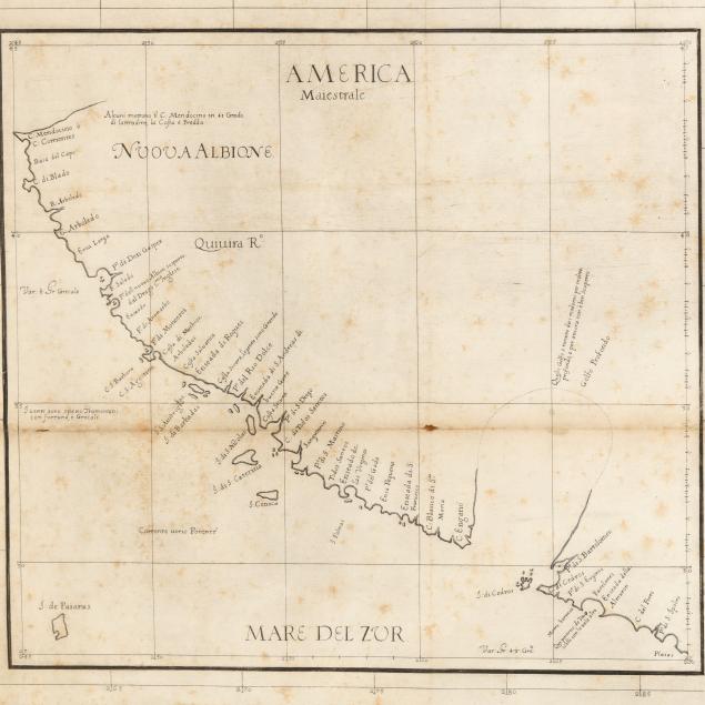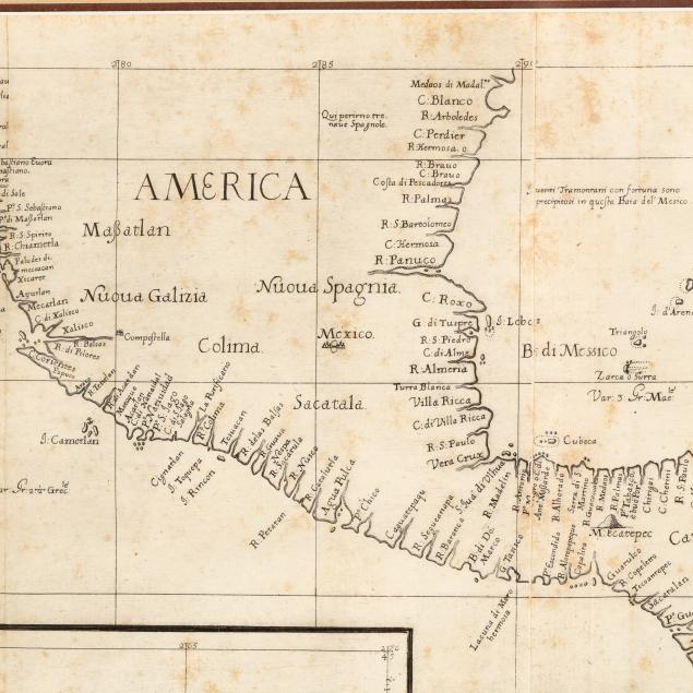 Robert Dudley. CARTA PRIMA GENERALE D'AMERICA DELL' INDIA OCCIDENTALE È MARE DEL ZUR. [Florence]: [Francesco Onofri], [1646]. First state with "6" in the top left corner and lacking the additional "Lº.2º.XV." in the title cartouche. A double-page copperplate engraving by Antonio Francesco Lucini; from the second part of Dudley's atlas Arcano del Mare; the map featuring the southern tip of California, Central America, and part of South America, along with southern Florida and the Caribbean; with inset map "America Maiestrale" on the left, including the coast of California with the interesting insertion of Golfo Profondo, and numerous place names such as Mendocino, Monterey ("Moneerei"), and San Diego; includes a compass rose, sailing ship, italic calligraphy, and title cartouche; presented matted and in a lovely wooden frame. Burden 266; Phillips Atlases 457.