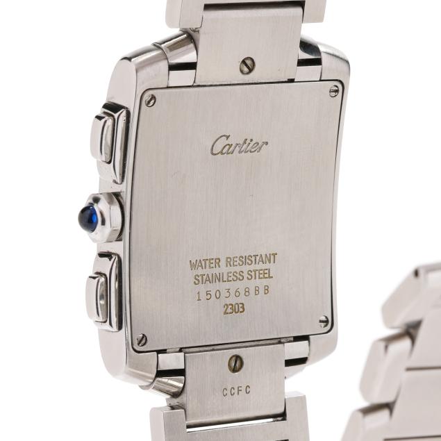 Tank case with signed cream colored dial, bold black Roman numeral hour markers, blued steel sword hands, subsidiary date dial at 12:00 hour, and subsidiary chronograph dials at 4:00 and 8:00 hours, the stainless steel bracelet stamped CCFC completed with signed butterfly deployant clasp, the signed caseback numbered 150368BB / 2303.