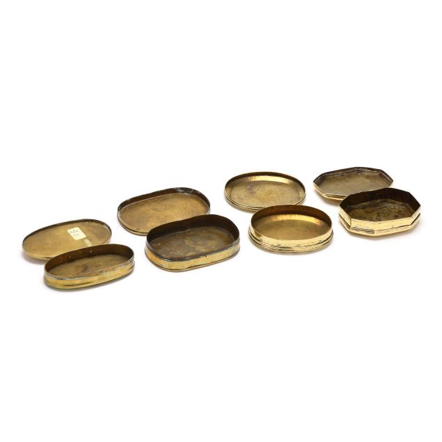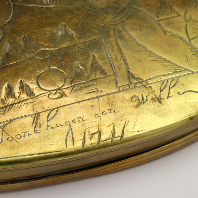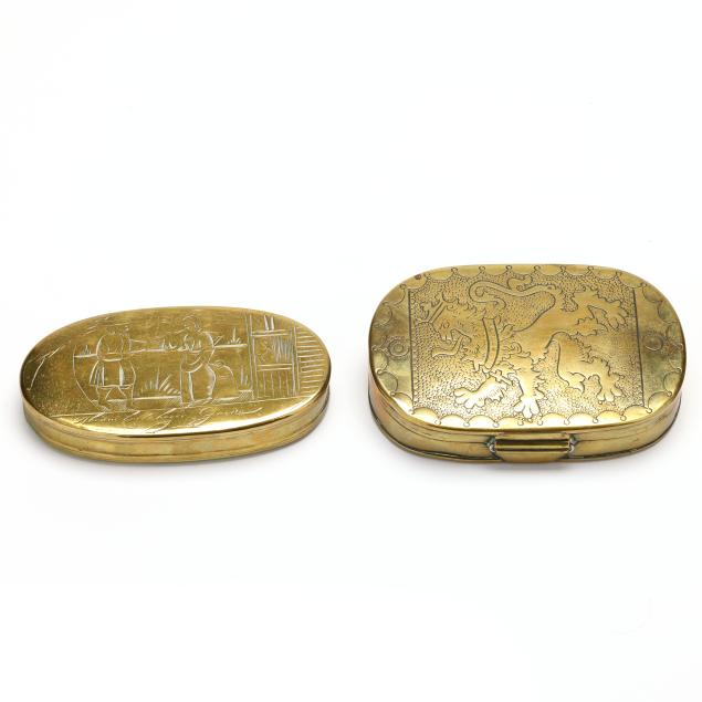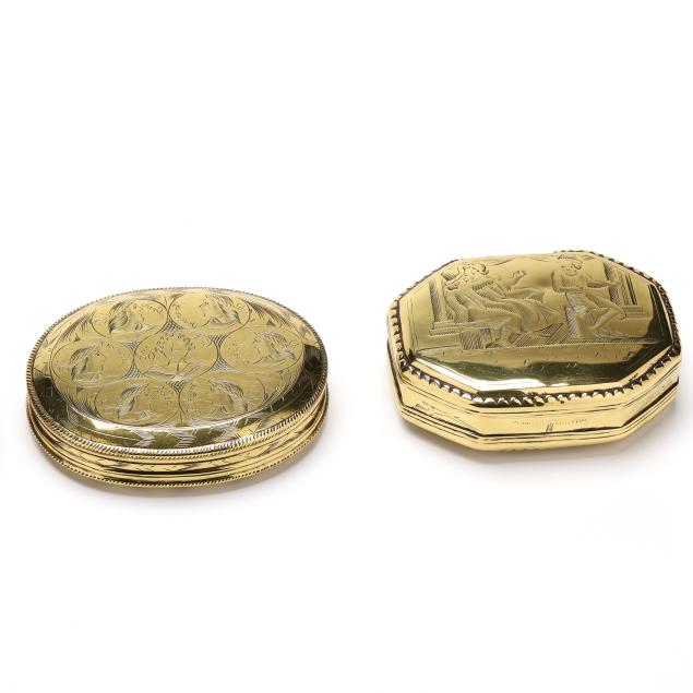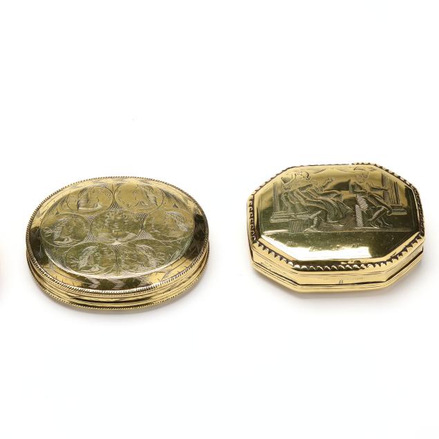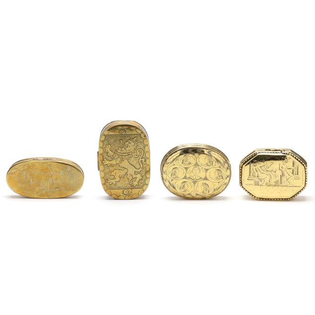 (4) engraved brass boxes to include: a late18th-early 19th century box with heraldic lion; a circa 1800 box featuring vignettes of figure heads for European countries to one side and cityscapes of their corresponding capitals to the verso; a mid-to late 18th-century hinged box with genre scenes and inscriptions to each side; and a hinged box dated 1711 with biblical scenes and inscriptions.