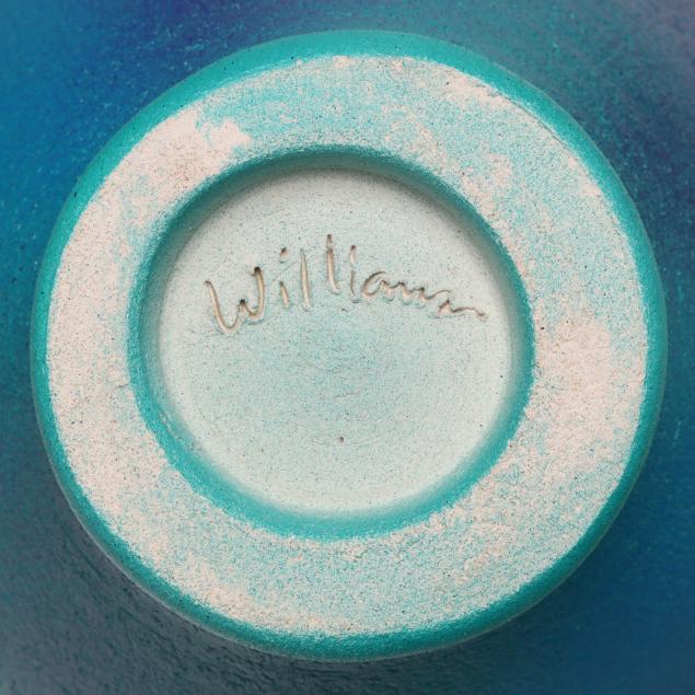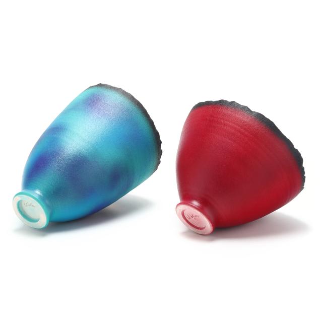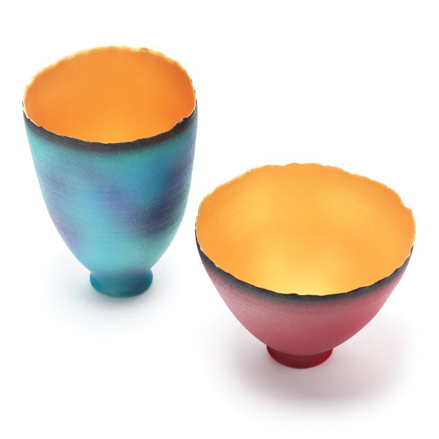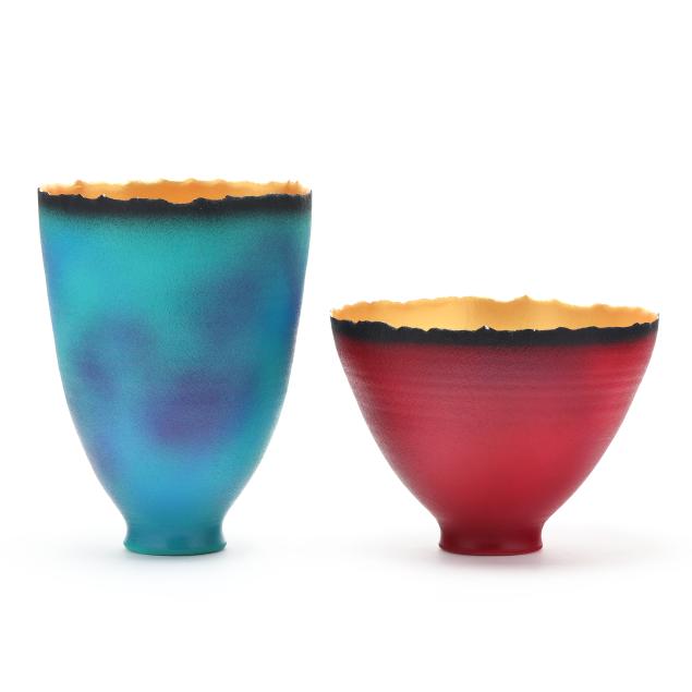St. George, Utah, contemporary wheel thrown clay vessels with organic rim, fired twice and airbrushed with brilliant colors on the exterior and glowing gold acrylic on the interior, varnish sealed, signed to the underside.