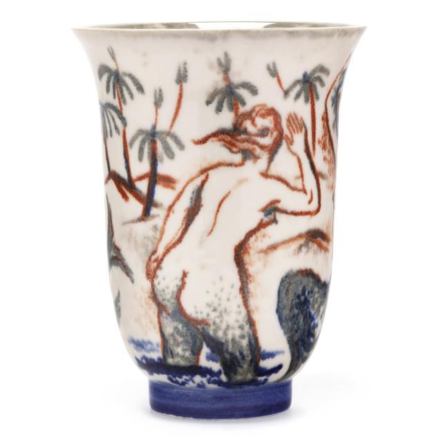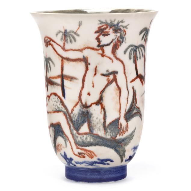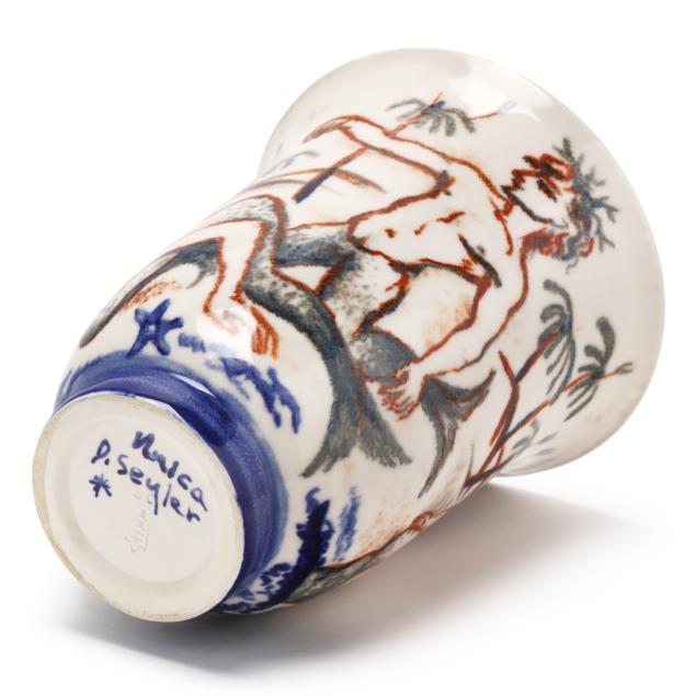 Mid-20th century, baluster form porcelain vase with round foot, glaze decorated in iron oxide cobalt and celadon tones depicting three mermaids and merman, signed and marked "Unicas / D. Seyler / * / [impressed manufacturer mark]/ 95" to the underside.