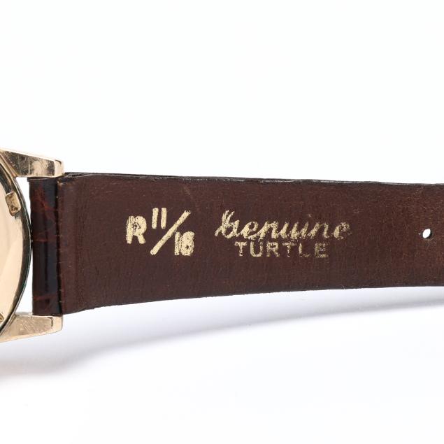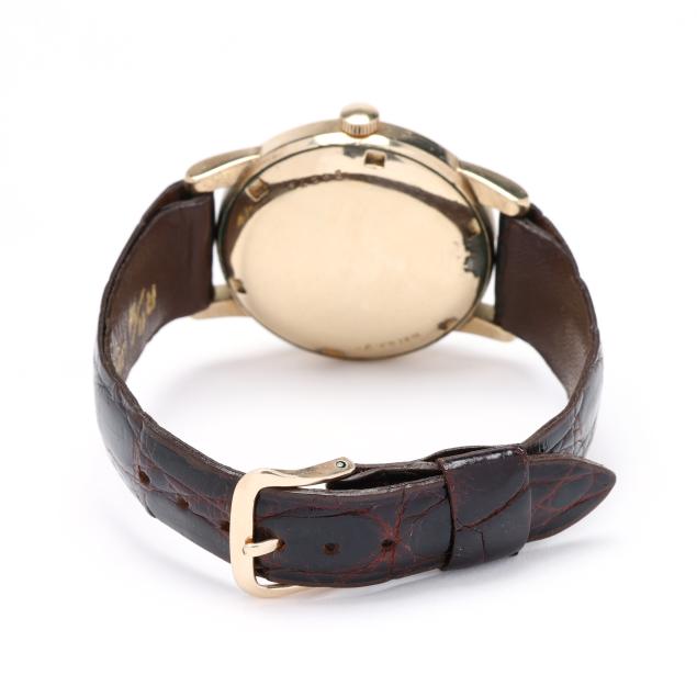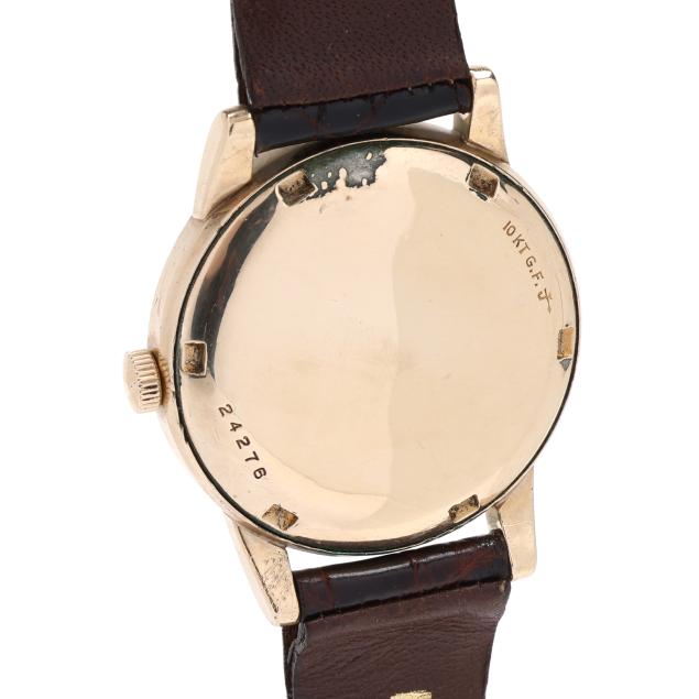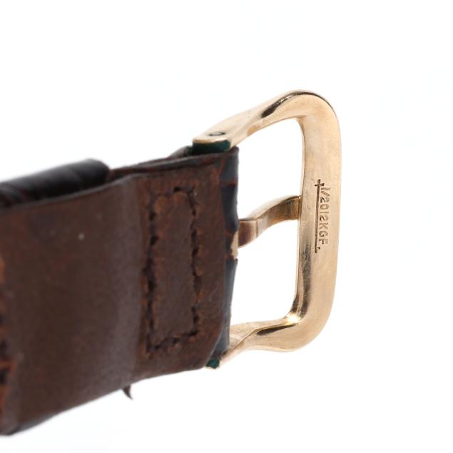 Automatic, ETA 2821, caseback number 24276, the round gold-filled case with polished bezel, the signed white dial with black Arabic numeral hour markers, red Arabic numeral 24-hour register, and black and red diamond hands, the brown textured leather strap with gold-filled buckle stamped 1/20 12K GF, the caseback stamped 10KT G.F., and with a maker's mark.