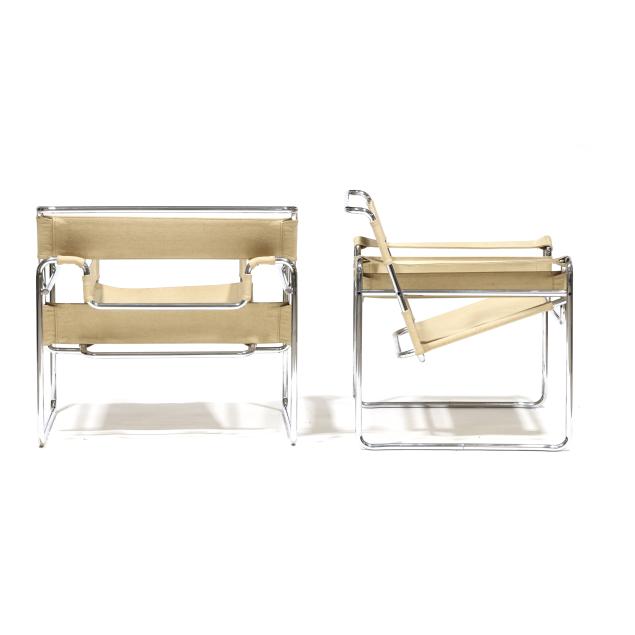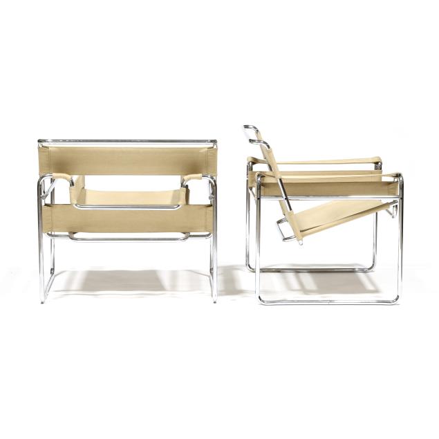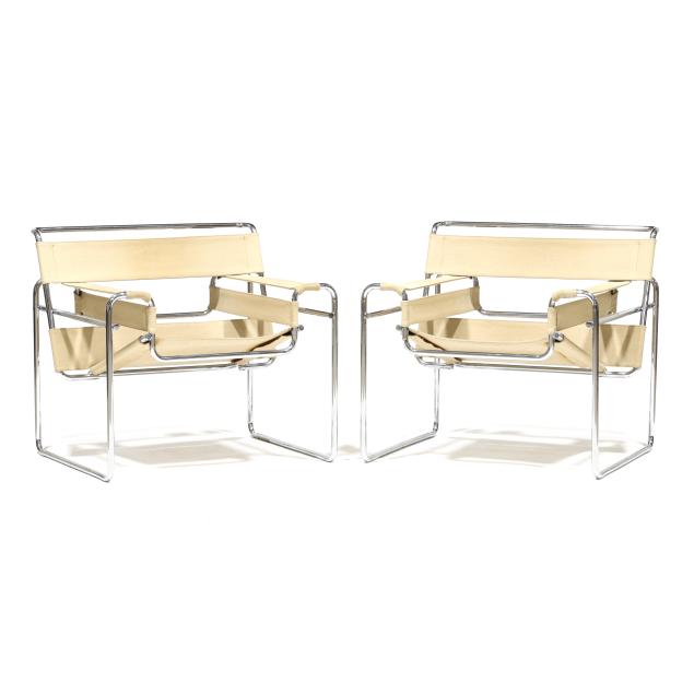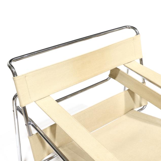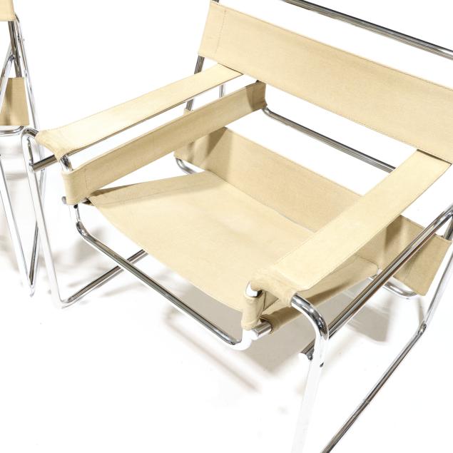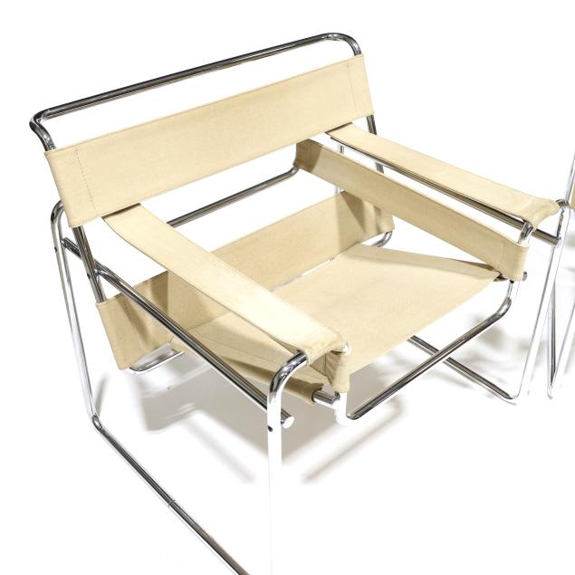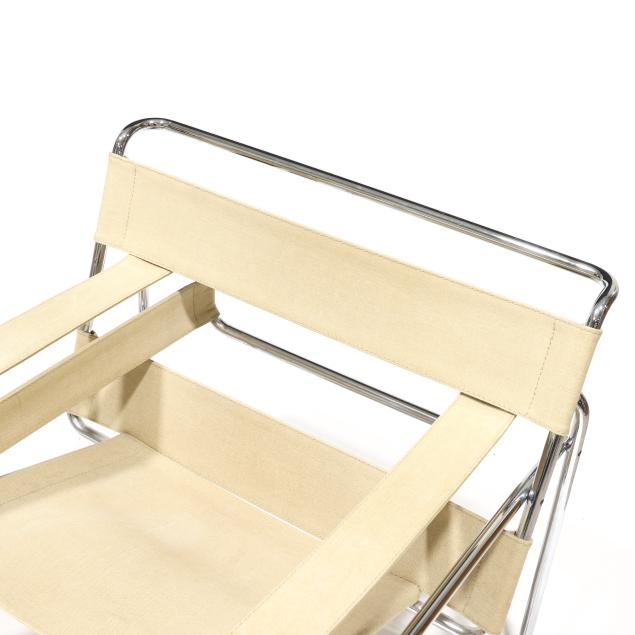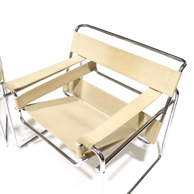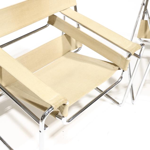 Circa 1970, likely Italian production, tubular chrome steel frames, ivory colored canvas strap back/arm/seat, unmarked.