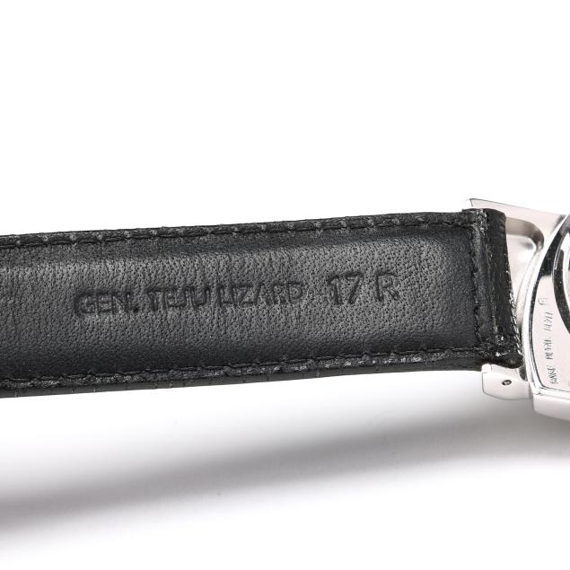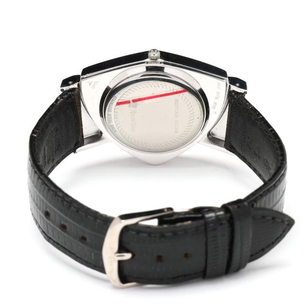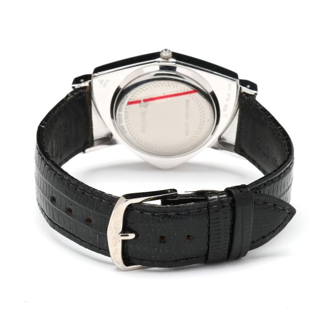 Circa 1997, quartz, ETA 955.412, reference number 6109, the triangular silver-tone base metal case with polished bezel, the signed black dial with silver-tone dot hour markers and silver-tone dauphine hands, the signed black textured leather strap stamped Gen. Tejij Lizard and completed with silver-tone buckle, the signed stainless steel caseback marked Base Metal Bezel / Stainless Steel Back / Registered Edition.