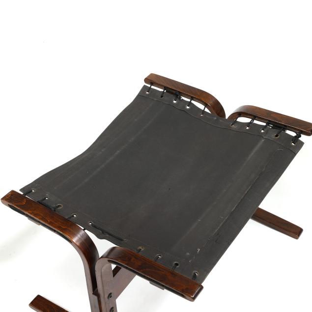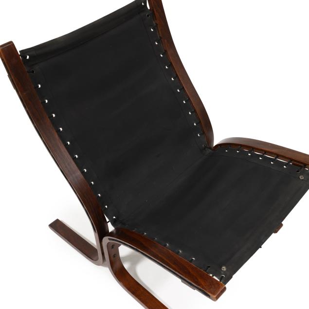 Circa 1970, laminated bent rosewood frame, black canvas sling, black leather cushions, labeled.