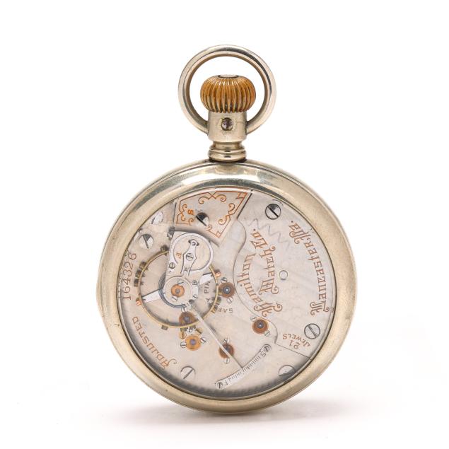 Circa 1901, lever set and stem wind, twenty-one jewels, grade 940, serial number 164326, the white metal open face case with exhibition caseback, the signed white dial with oversized black Arabic hour markers, red Arabic minute register, blued steel spade hands, and subsidiary second dial at 6:00 hour, the signed movement with damaskeened finish and numbered 164325.