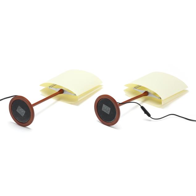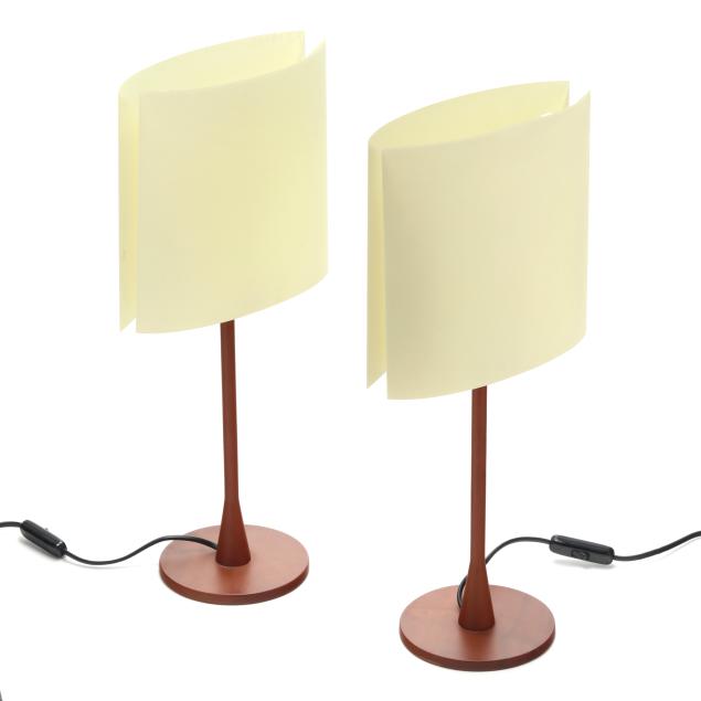 For Fantana Arte, fourth quarter 20th century, elegant slender wood table lamps base, polycarbonate diffuser shade with single socket fixture, wired for EU outlets with US adapter, labeled to underside.