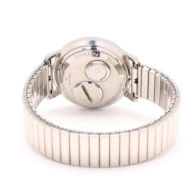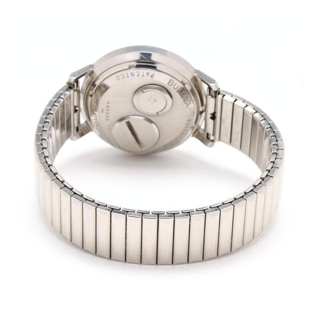 Circa 1966, electronic, Accutron 214, serial number A49356, the round stainless steel case with polished bezel and signed crystal, the skeleton face with chapter ring with luminescent baton hour markers and luminescent obelisk hands, the stainless steel expansion band signed Speidel, the signed caseback numbered A49356 and with date code M6.