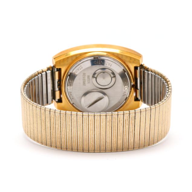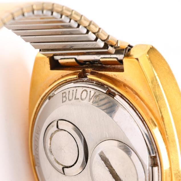 Circa 1973, Accutron 2141, case number 7323-1, serial number 5-10514, the barrel shaped gold-plated case with polished bezel and signed crystal, the skeleton face with luminescent baton hour marker chapter ring and luminescent tuning fork hands, the gold-tone expansion bracelet band signed Speidel, the signed caseback numbered 5-10514.