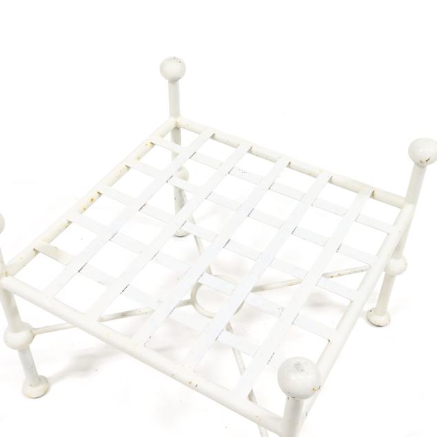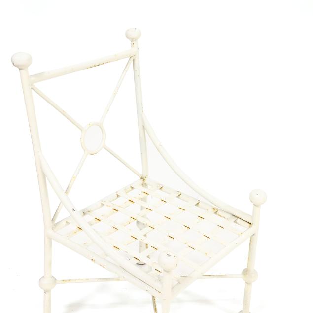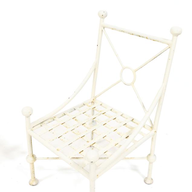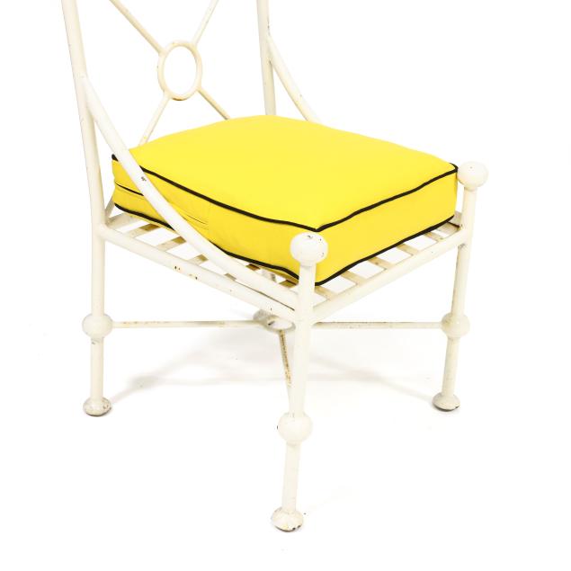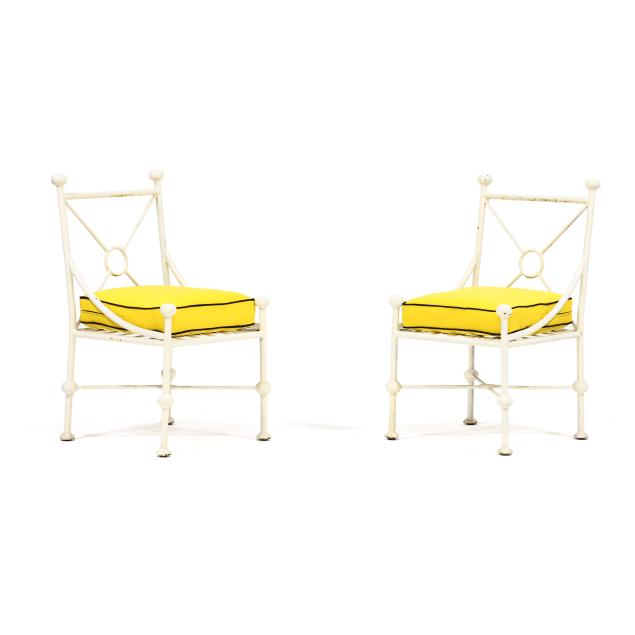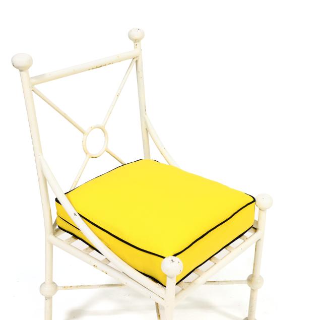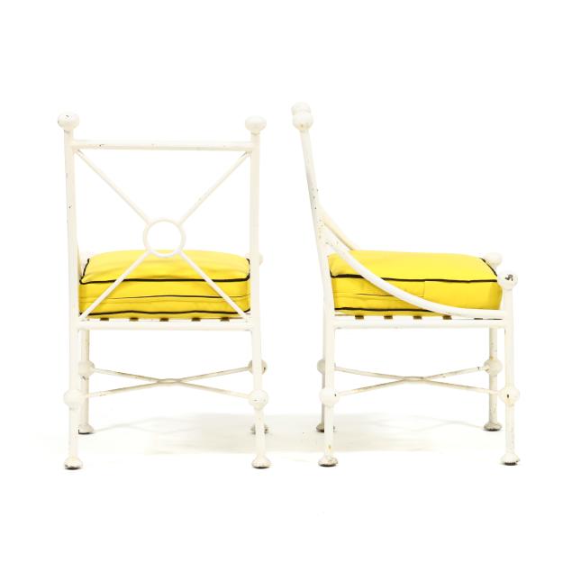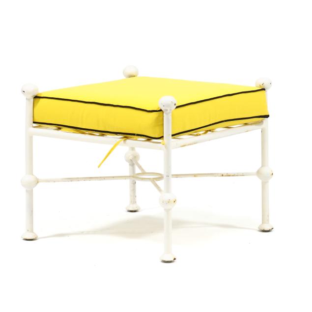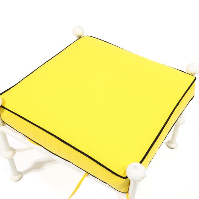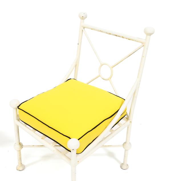 Circa 1960, for Salterini, white painted iron, yellow outdoor cushions with black piping, including a pair of chairs (39.5 x 22 x 22 in.), and one ottoman (21.5 x 25 x 25 in.), unmarked.