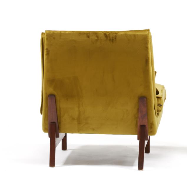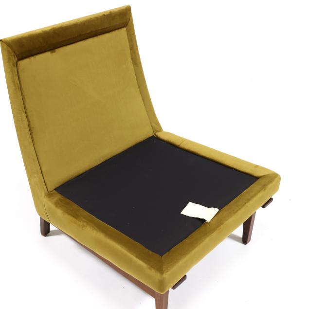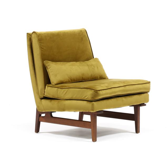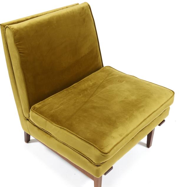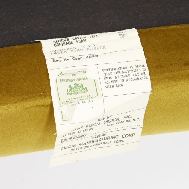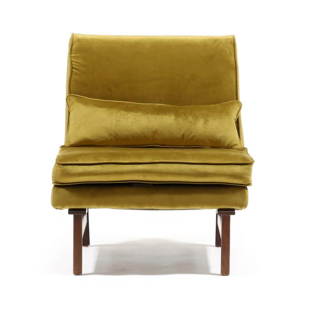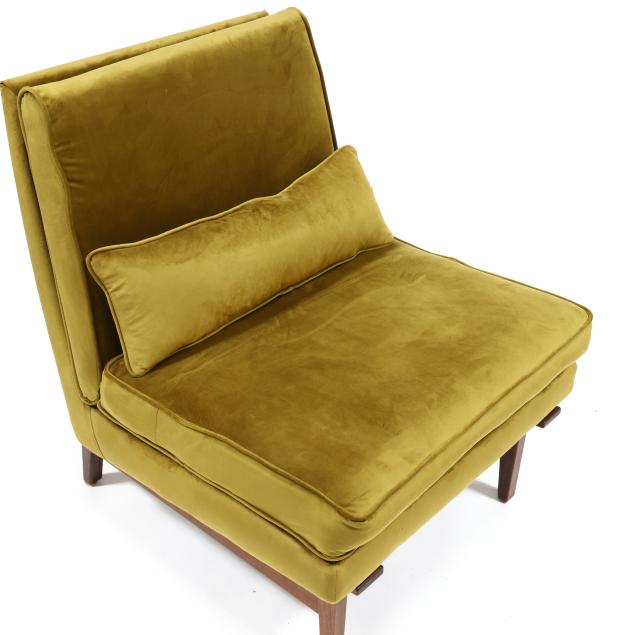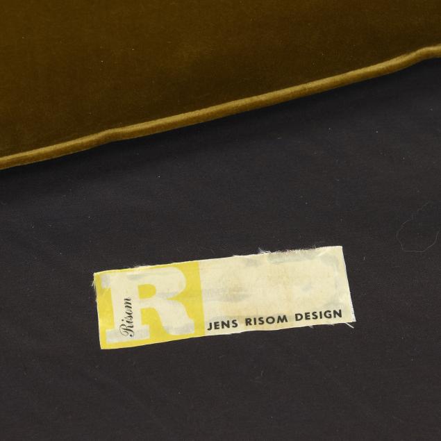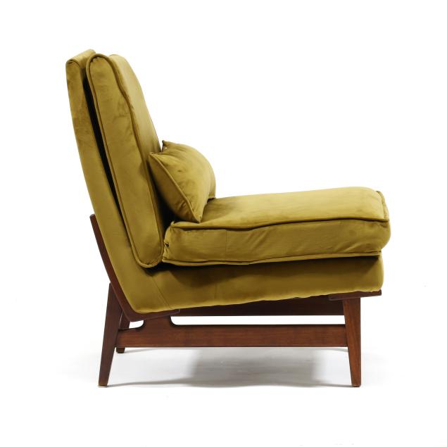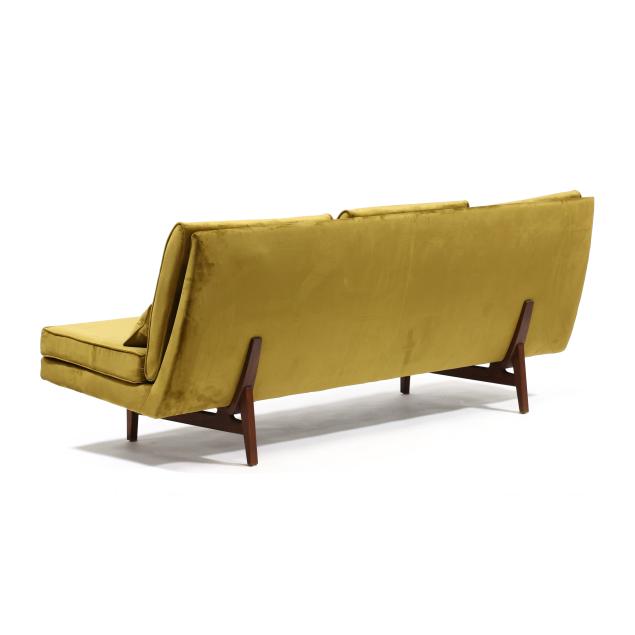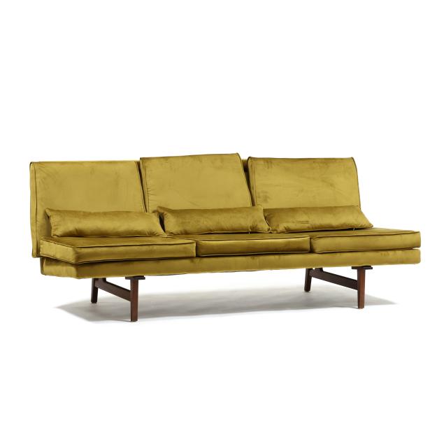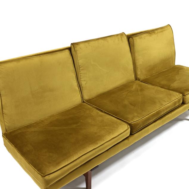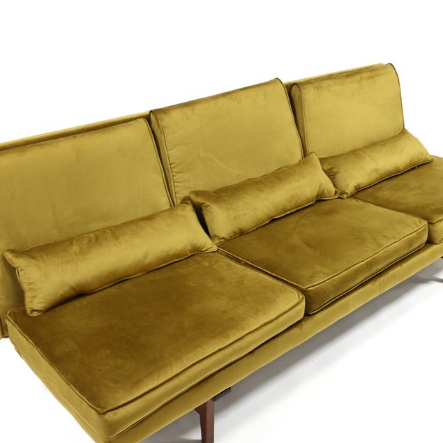 Circa 1950, later plush olive upholstery with loose cushions and throw pillows, walnut legs, unmarked.
