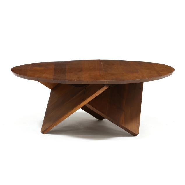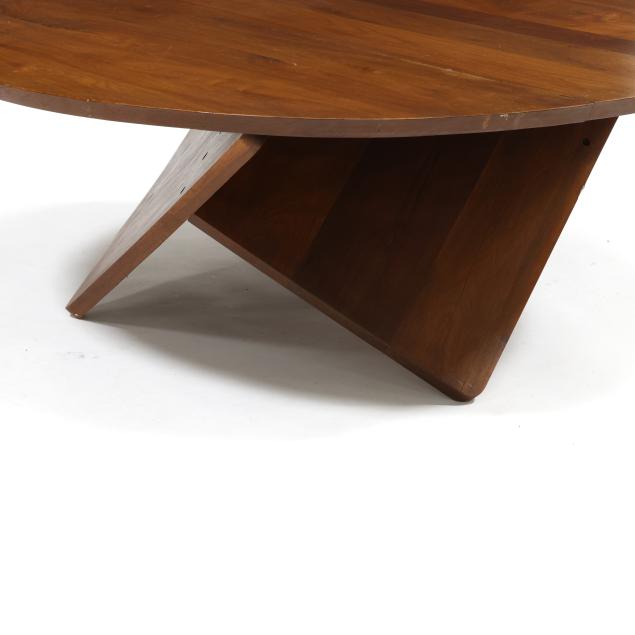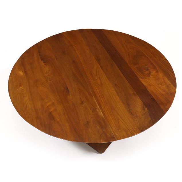 Circa 1950, walnut, circular top, angular panel tripod base, appears unmarked.