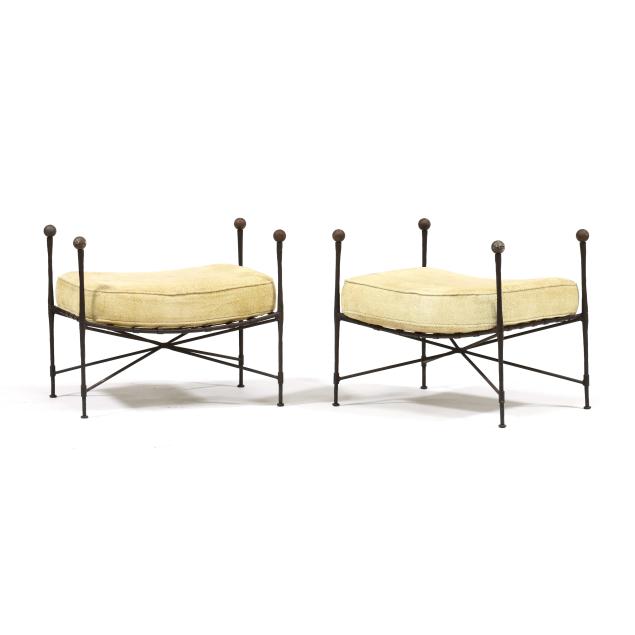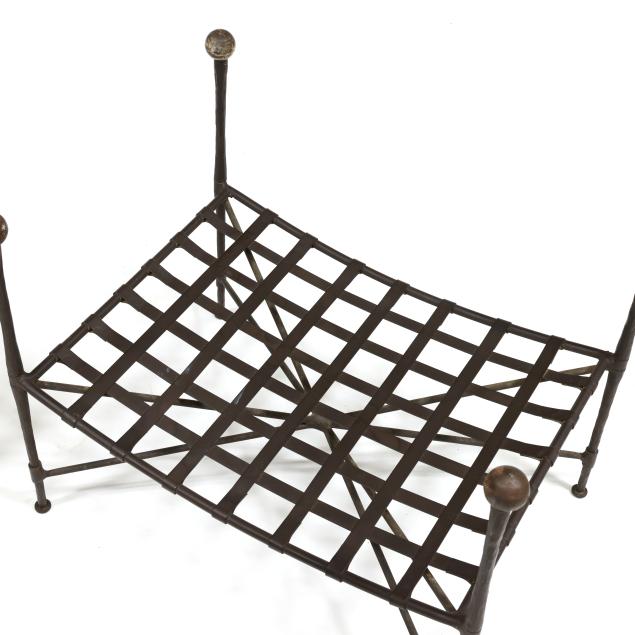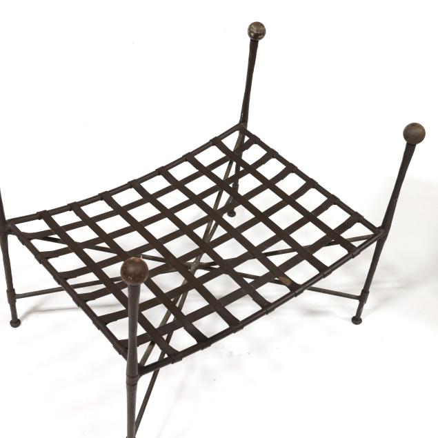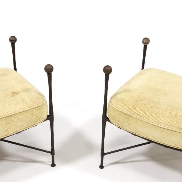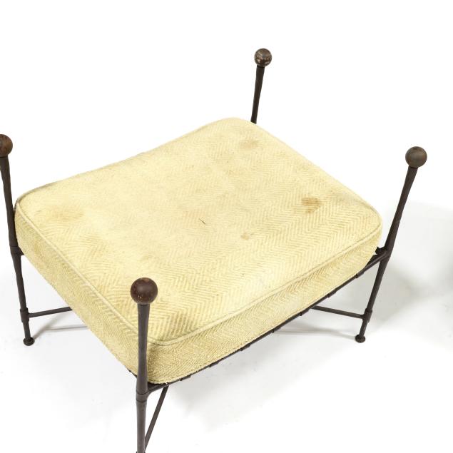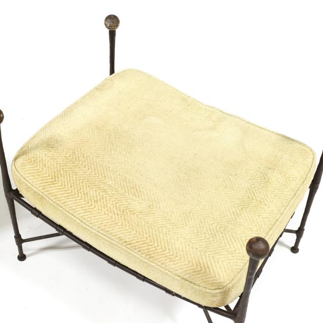 Mid 20th century, for Salterini, black painted iron, cream chevron upholstered loose cushions, unmarked.