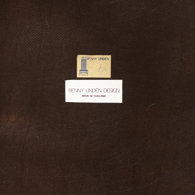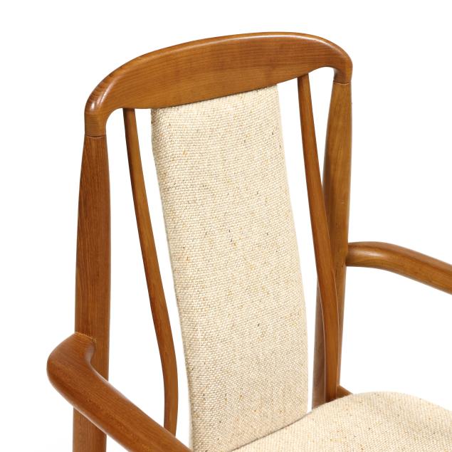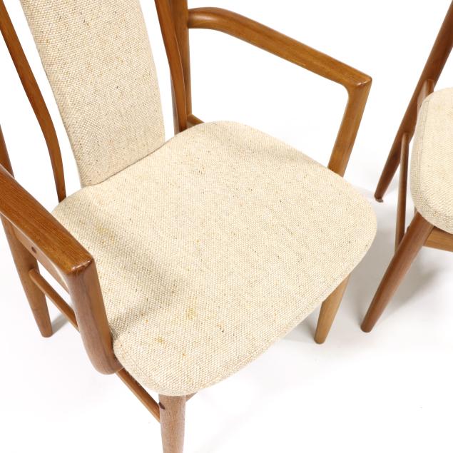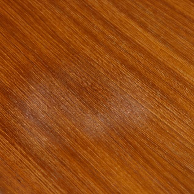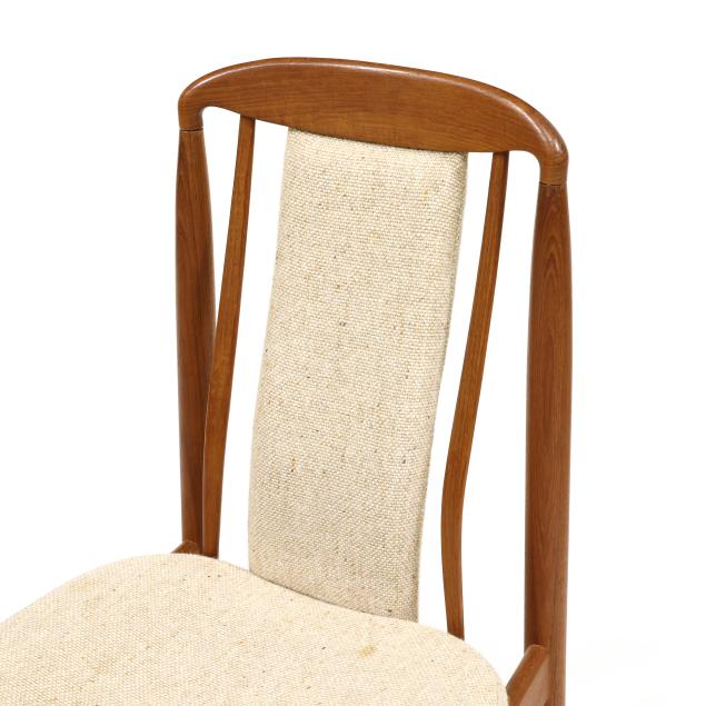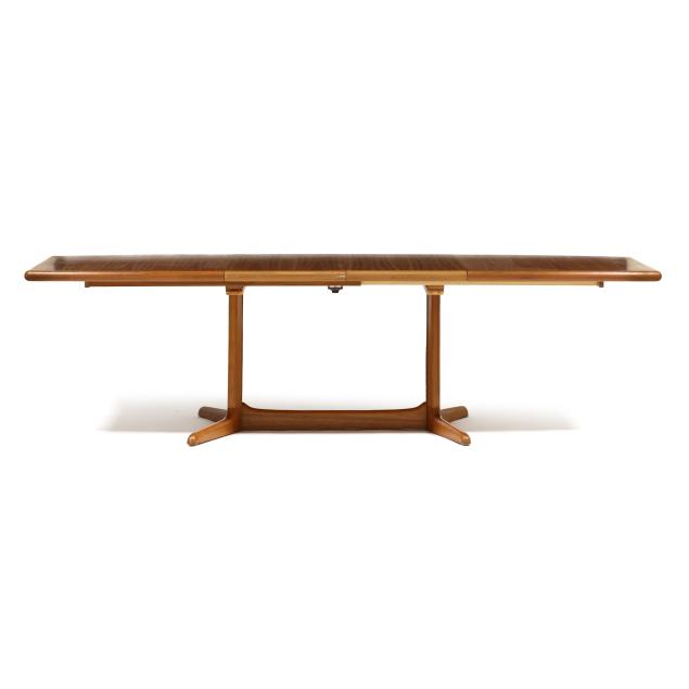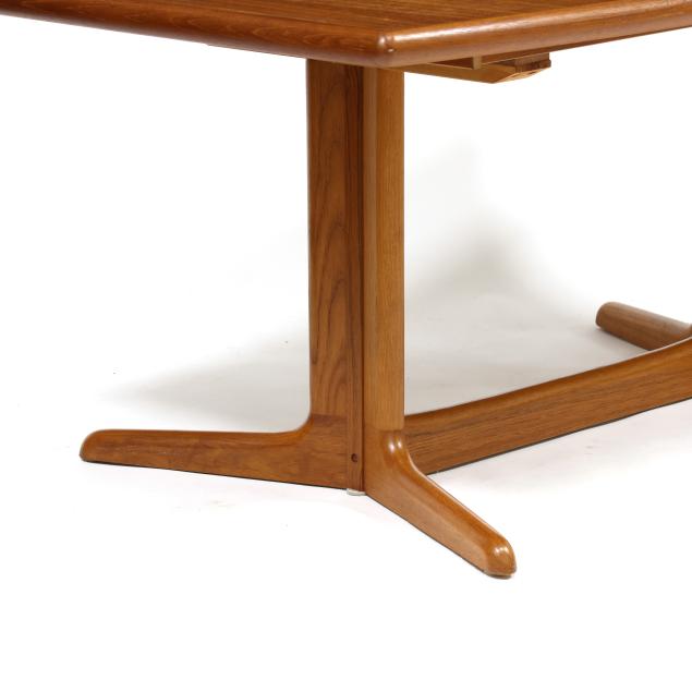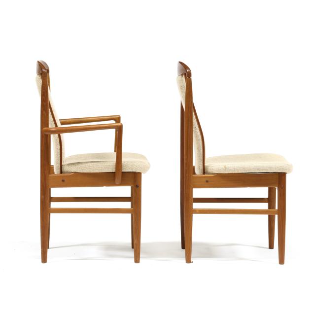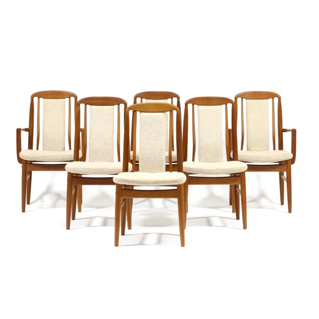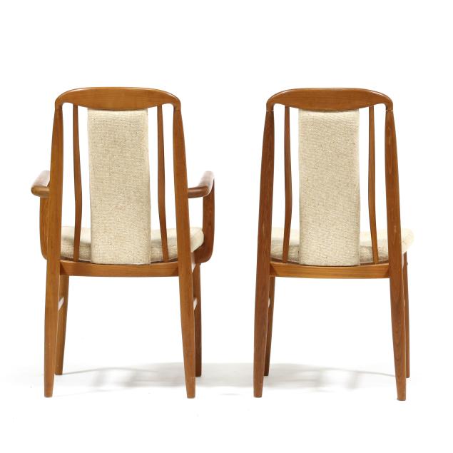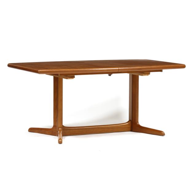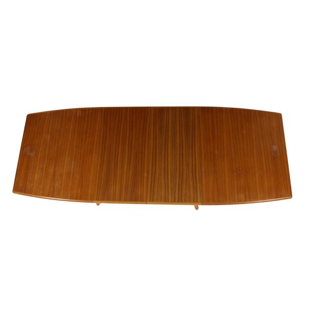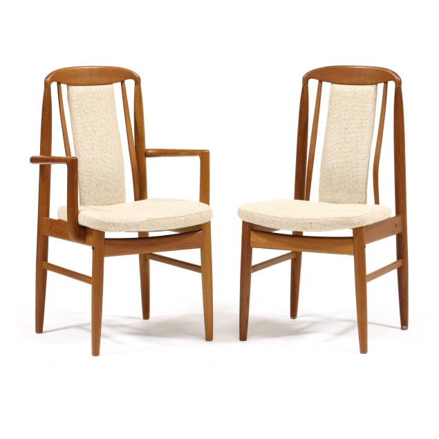Late 20th century, teak and teak veneer, including a slight lozenge shaped dining table with banded edge, trestle form base with two leaves (29 x 39 x 65 in., each leaf 19.75 in.); together with two armchairs (37 x 22 x 20 in.) and four side chairs (seat height 19 in.), labeled.