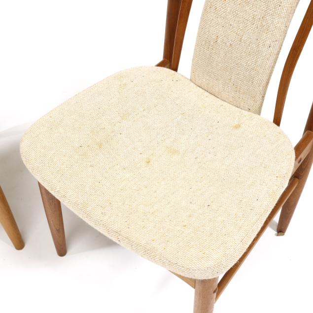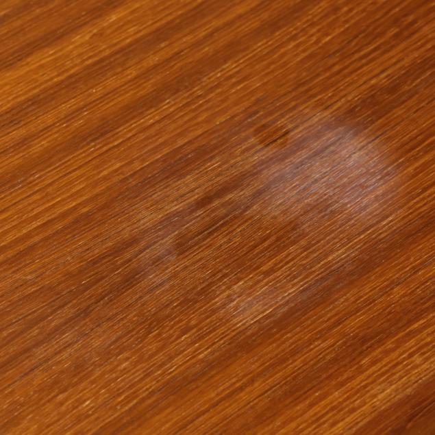Overall good usable condition; the table top with some finish inconsistencies and surface scratches from use; the leaves appear to have less use; the chairs with some staining to the upholstery; however, the frames appear to be in good structural condition.