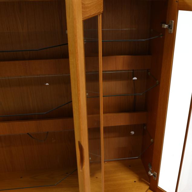 Late-20th-century, two part form, upper case with angled hinged glass doors, shelved and lighted interior, the base cabinet with three drawers flanked by two hinged cabinet doors with shelved interior, labeled.