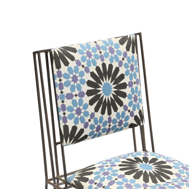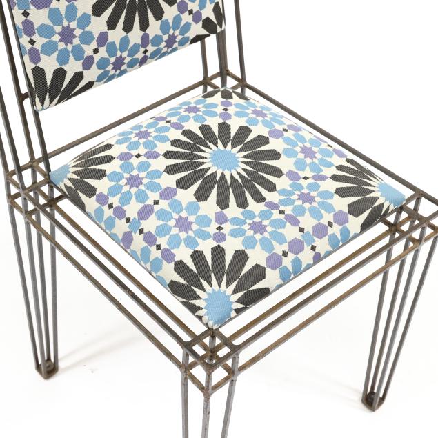 Contemporary, skeletal iron frames with geometric upholstered back and seats, unmarked.
