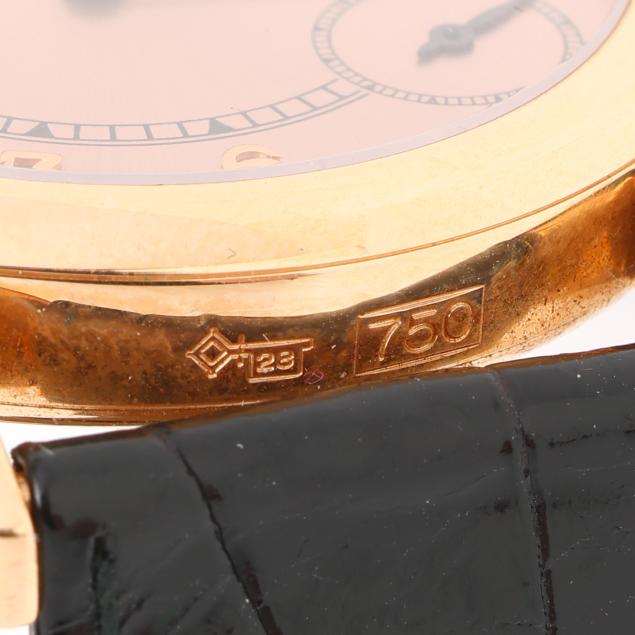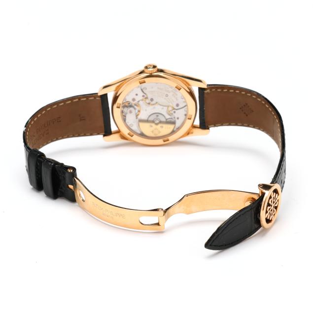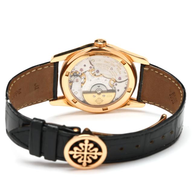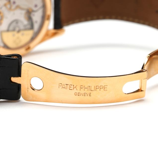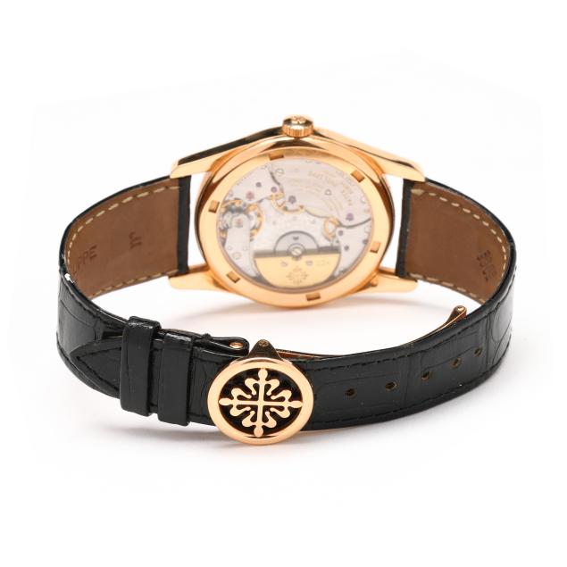 Automatic, Patek Philippe 240PS, reference number 5000, serial number 1963173, the round rose gold case with polished bezel and Swiss hallmarks for 18KT, the signed rose-tone dial with rose gold Arabic numeral hour markers, blued steel leaf hands, and subsidiary second dial at 4:00 hour, the signed black leather strap completed with a signed rose gold deployant clasp with Swiss hallmarks for 18KT, and with an exhibition caseback.